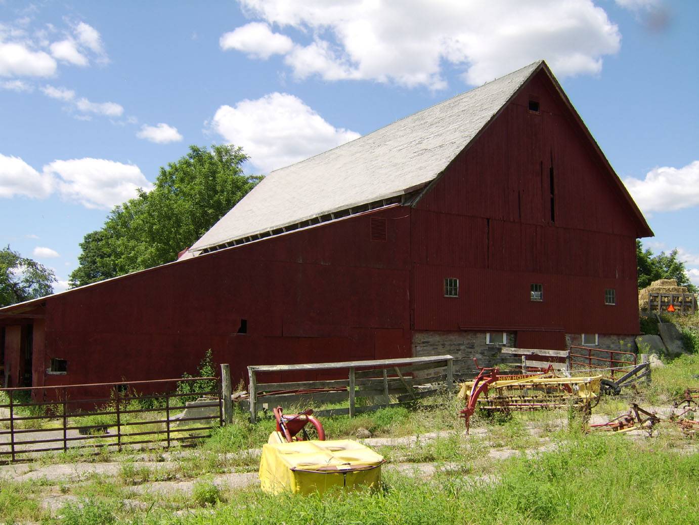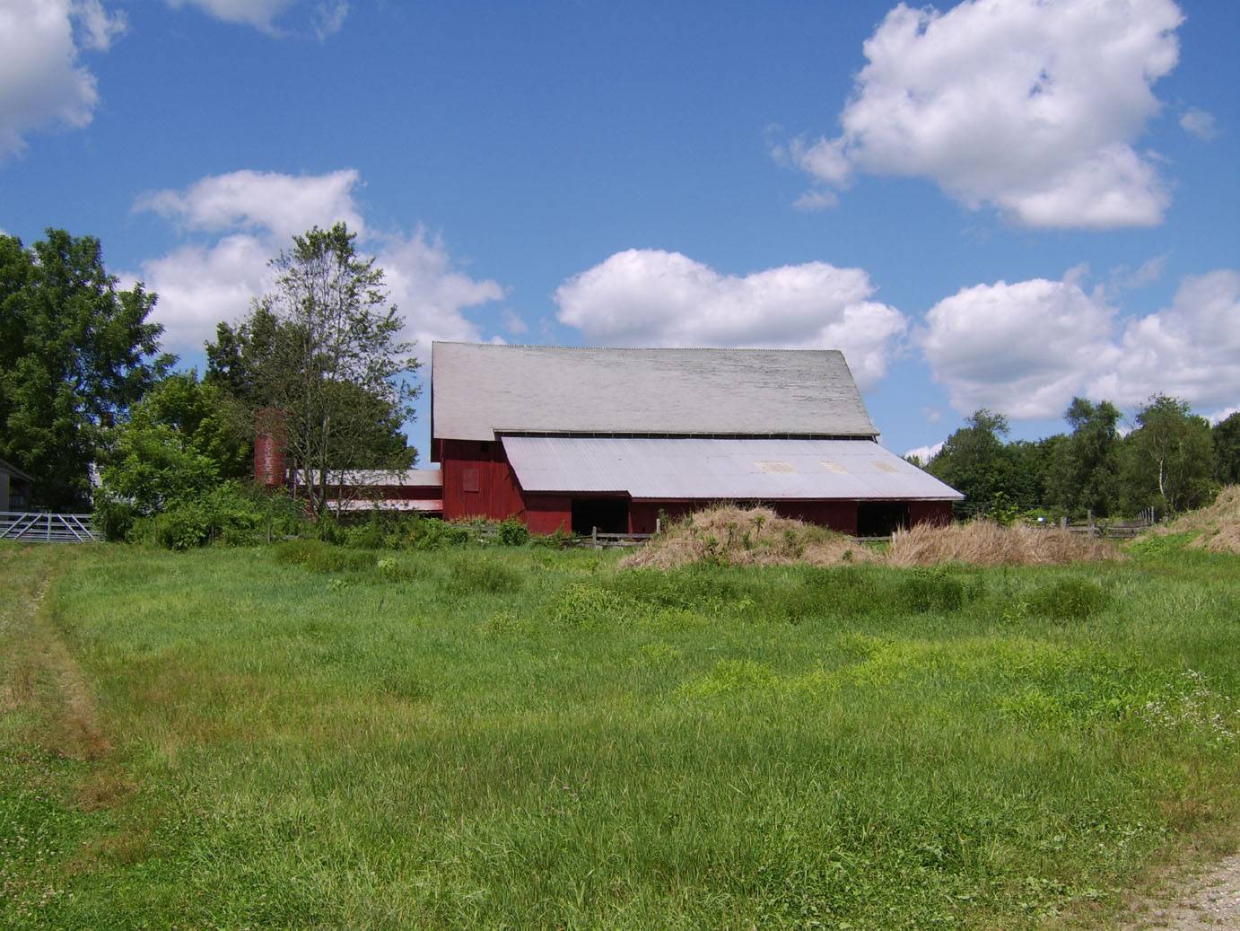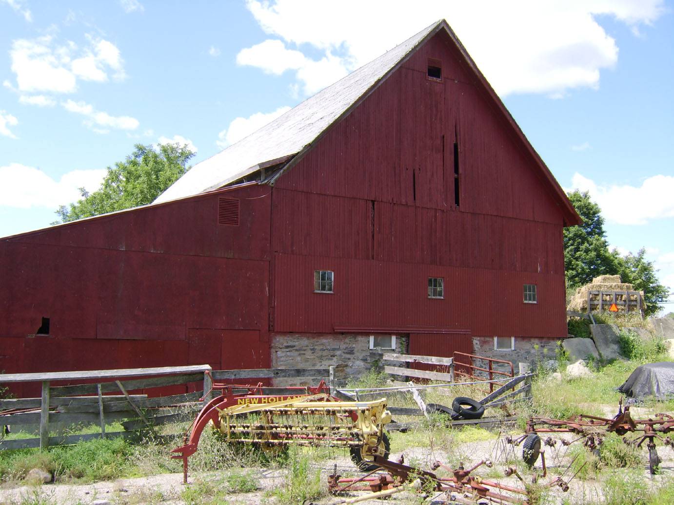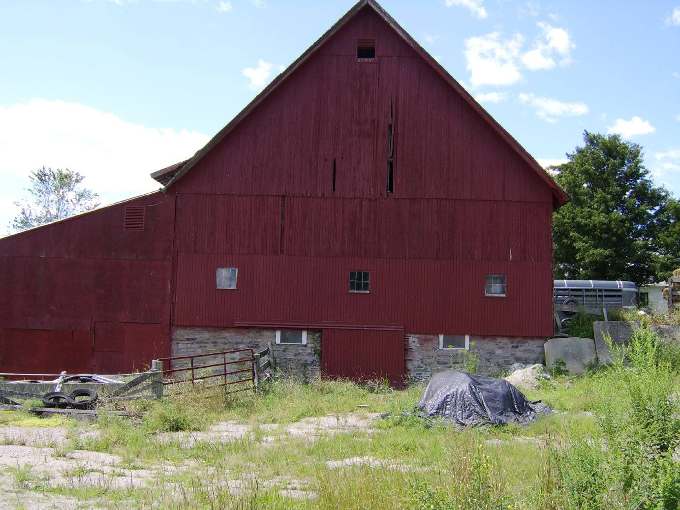 This is a 1 1/2 story six-bay side or eave-entry bank barn with a shed-roofed addition and a gable-roofed addition. The main facade and the ridge-line of the barn are parallel to Exeter Road, which runs approximately east-west. The main entries are a pair of double-height exterior sliding doors in the second and fifth bays. The easternmost bay has a pass-through door. The westernmost bay has a wrap-around roof that connects to a gable-roofed addition that extends west from the west gable-facade. It is a milkhouse. The south eave-facade of the barn has a shed-roofed pole barn addition that encompasses the entire facade. The grade drops away sharply on the gable-facade, where a mortared field-stone basement is revealed. In the basement of the facade is an exterior sliding door flanked by basement window openings. Above in the main level of the barn are three six-pane windows. The only other opening is a window space below the apex of the roof. At the point of intersection of the barn and shed-roofed addition is a flair that covers the intersection. The barn has vertical flush-board siding painted red with white trim and a mortared filed-stone foundation.
