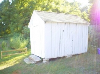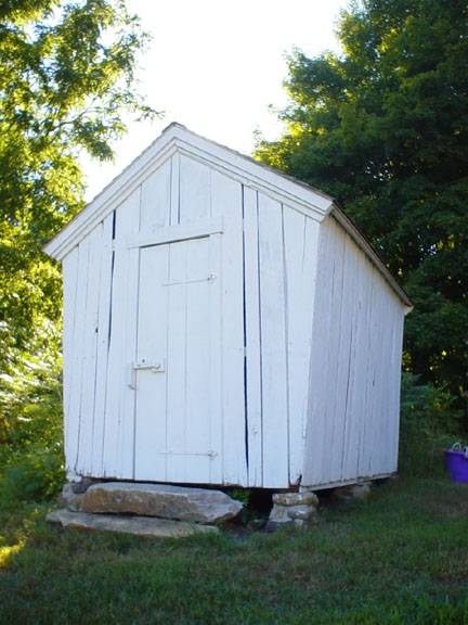 The Corn crib is a traditional structure typical of its type, with walls canted outward from bottom to top and a gable roof. The slatted wood wall surfaces are painted white and the roof is wood shingles. The foundation is a series of stone piers.