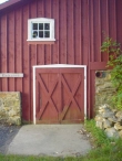 The main entry doors are a pair of hinged x-braced doors in the east bay of the south eave-side. A pair of similarly made hay doors is above at the loft level. To the left in the west bay there is one six-pane window high under the eaves. A 1-story shed-roofed wing encompasses the width of the east gable-end and extends east 12’. The grade slopes down toward the east and north. A fieldstone foundation wall is exposed along the south side of the shed-roofed wing. The east eave-side of the wing has an exposed basement level with two six-pane stable windows with trim in the basement level and two more at the main level above. The east gable-end is blank above the shed roof. The north eave-side has an exposed mortared fieldstone foundation wall across the basement level of the main block. The east wing has a pair of barn doors for access to the basement and a single six-pane stable window with trim at the main level. To the right (west) in the main block, there are two four-pane windows, possibly added when the barn was adapted as an exhibit space.