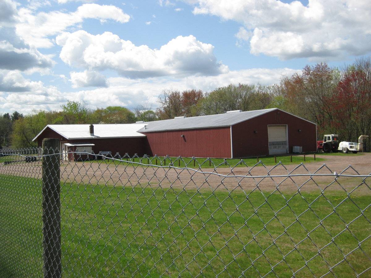 The wooden frame of the T-shaped barn is supported on cement plastered masonry foundation. The barn has metal sheathing on the walls and on the intersecting gable roofs.