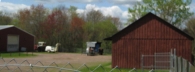 The wooden frame of the barn has board-and-batten siding on walls and metal sheet roofing.