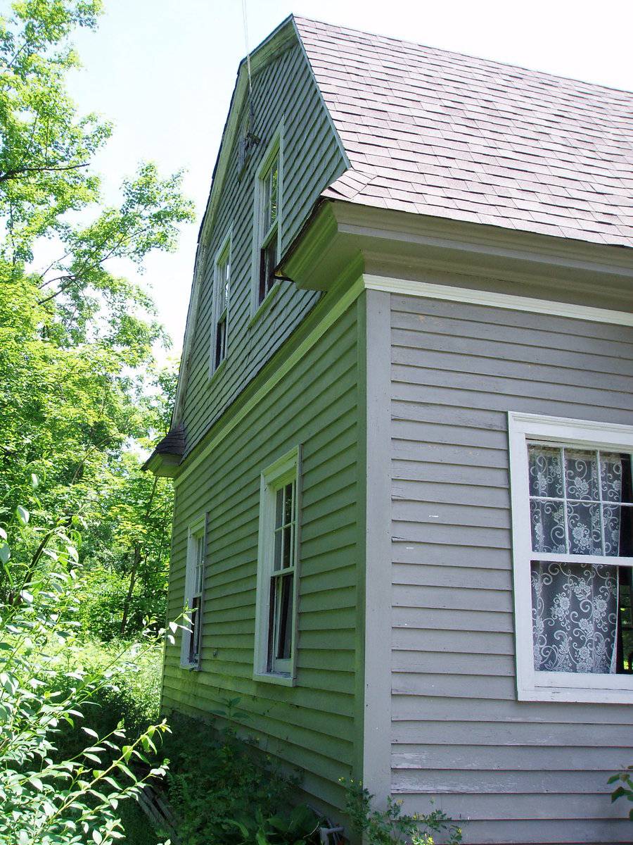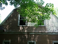 The north gable-end has two evenly-spaced six-over-one double hung windows at the ground level. There are two