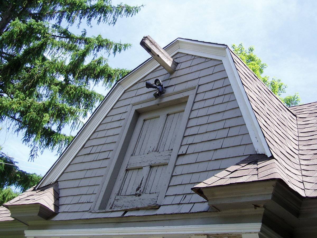 roof, shingled attic walls, and six-over-one windows, and the modillion trim over the barn door, may suggest the