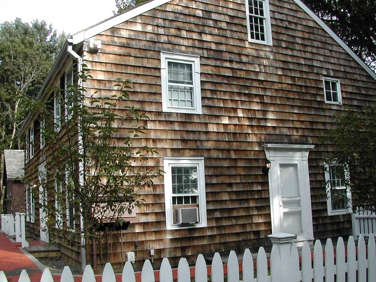 The barn (current Visitor’s Center) is located slightly northeast of and behind the c. 1639 house it is associated with. The ridge-line of the house runs parallel to that of the barn. A smaller barn (current garage) is located just north of the main barn, with a ridge-line running perpendicular to that of the main barn. Northwest of the barns are two small sheds or outbuildings. Stone walls encircle the historic house on all but its east side, and stone walls border the whole property along Old Whitfield Street and Stone House Lane. The total size of the property is 9 acres. The surrounding area is open land, residential, and woodland.