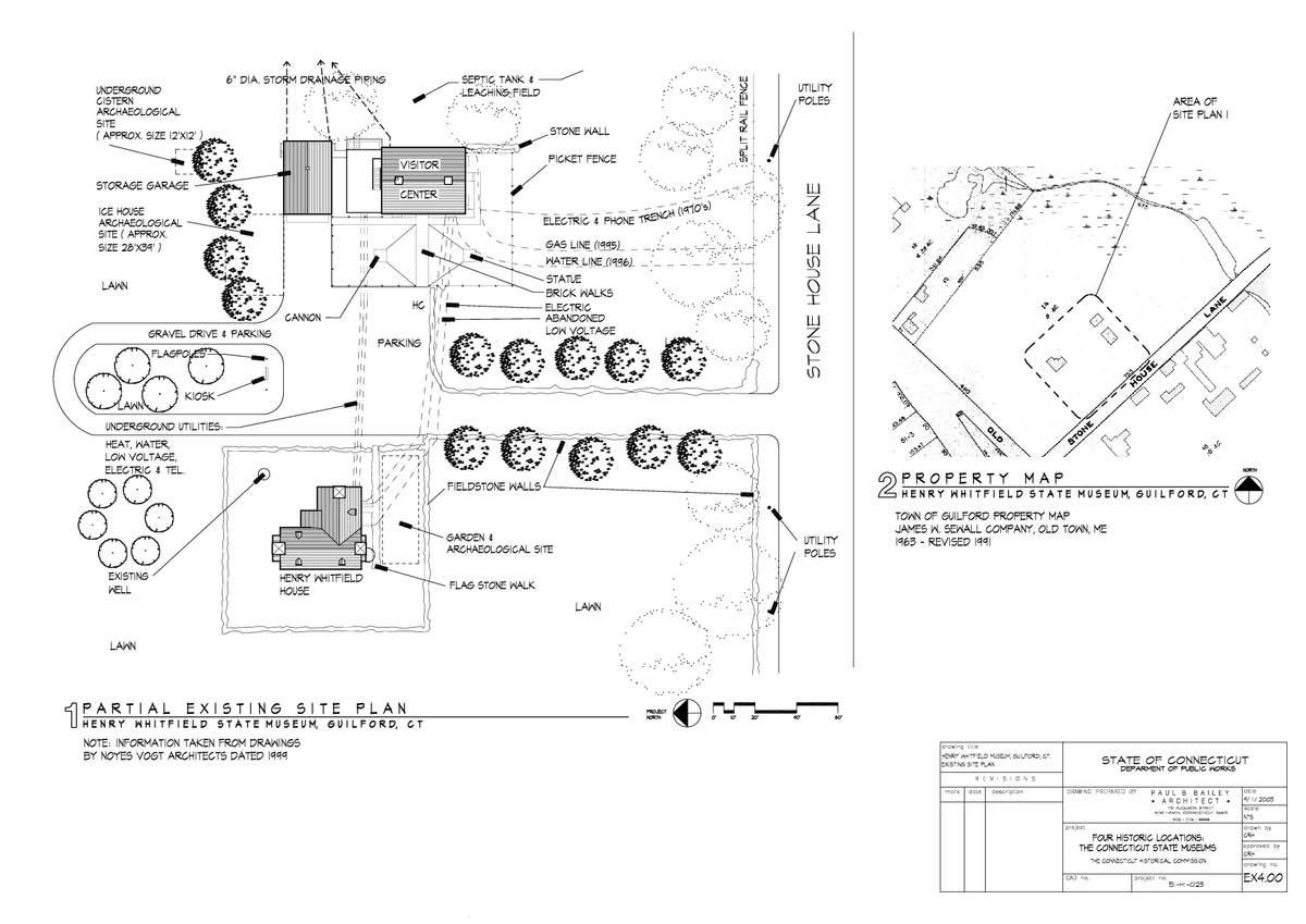 Structures on the site include the Henry Whitfield House, the Visitor Center, and a small barn used for storage. The Visitor Center is a post and beam wood framed structure built as a barn in the 1870s. The structure was altered into a caretaker’s dwelling in 1923. It now functions as the Visitor Center. The Henry Whitfield House is listed on the National Register of Historic Places as a National Historic Landmark. Use (Historic): Horse barn (c.1870s-1899); Museum caretaker's residence, offices, and collections storage (1923-1990) Use (Present): Visitor Center with gift shop, exhibit galleries, travel information center, research library, offices, and collections storage Site plan shows the Visitor's Center building which was built as a barn in the 19th c.