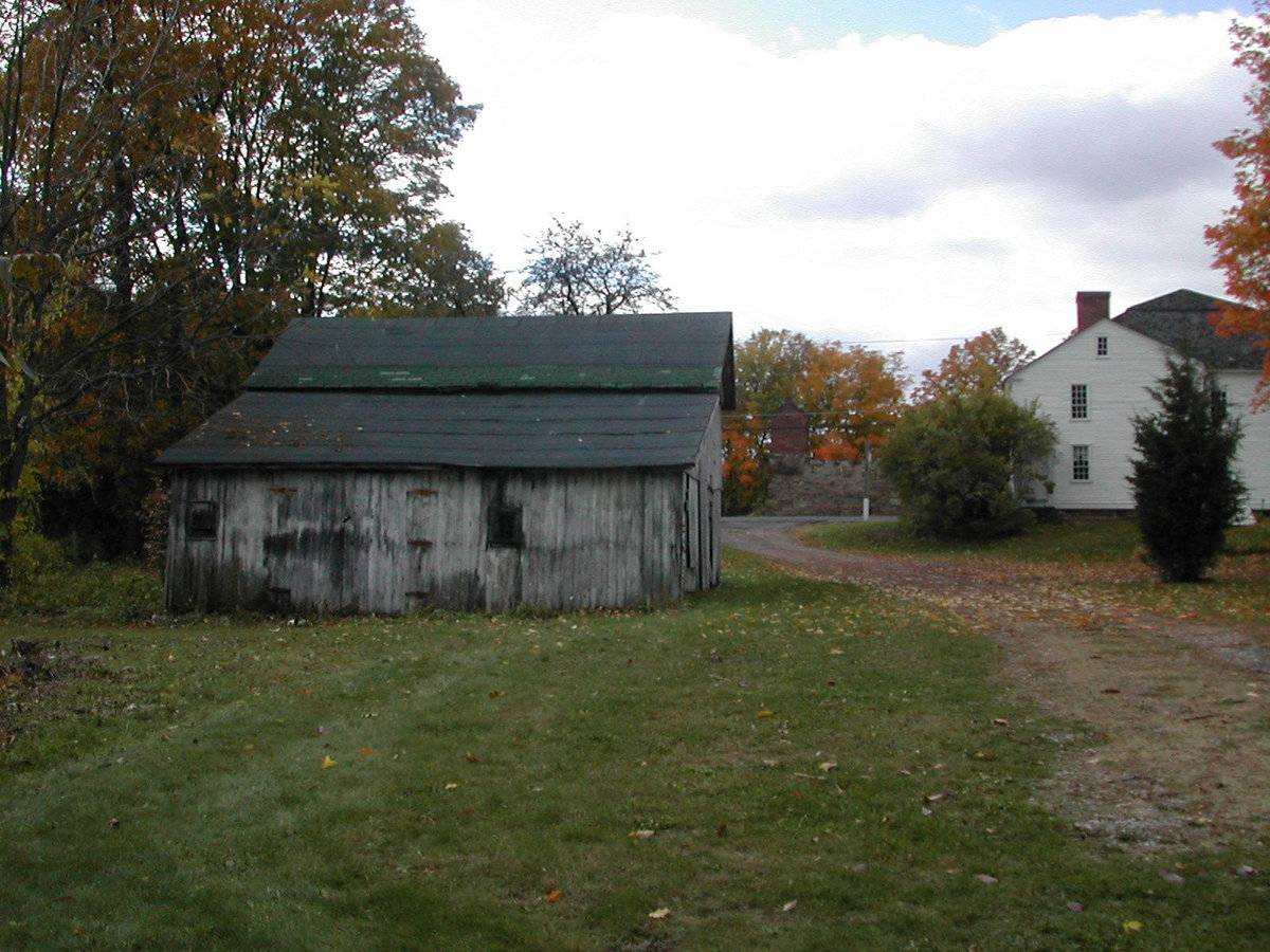 The Viets Tavern and Farm is listed in the National Register of Historic Places. The Tavern building dates to the 18th century. A barn (I) now attached to the tavern building, may have originally been free-standing, but was joined by an early 20th c. addition. Some of the farm buildings have been removed, but as of 2003 there remained a large post and beam barn (II), and ice house (III) and a tobacco barn (IV). These photos were taken in 2003 as part of a study performed by Paul B. Bailey Architect for the then CT Historical Commission. Barn-IV: The barn is visible from the road and the exterior is accessible to the public. It faces west and is in a residential area, across the street from Newgate Prison, adjacent to Viets Tavern. Bulit in 1850, it is constructed of fieldstone, board and batten with a gabled slate roof. It has a post and beam frame and New England topology. It was used as workspace and is still used that way today. Built for non-farm use, this barn has a shallow basement for temporary storage of copper ore. The upper level housed mine workers. Barn-III: The shed-roof addition on the east eave-side of the barn has now been completely removed from the structure with timber braces supporting the walls.
