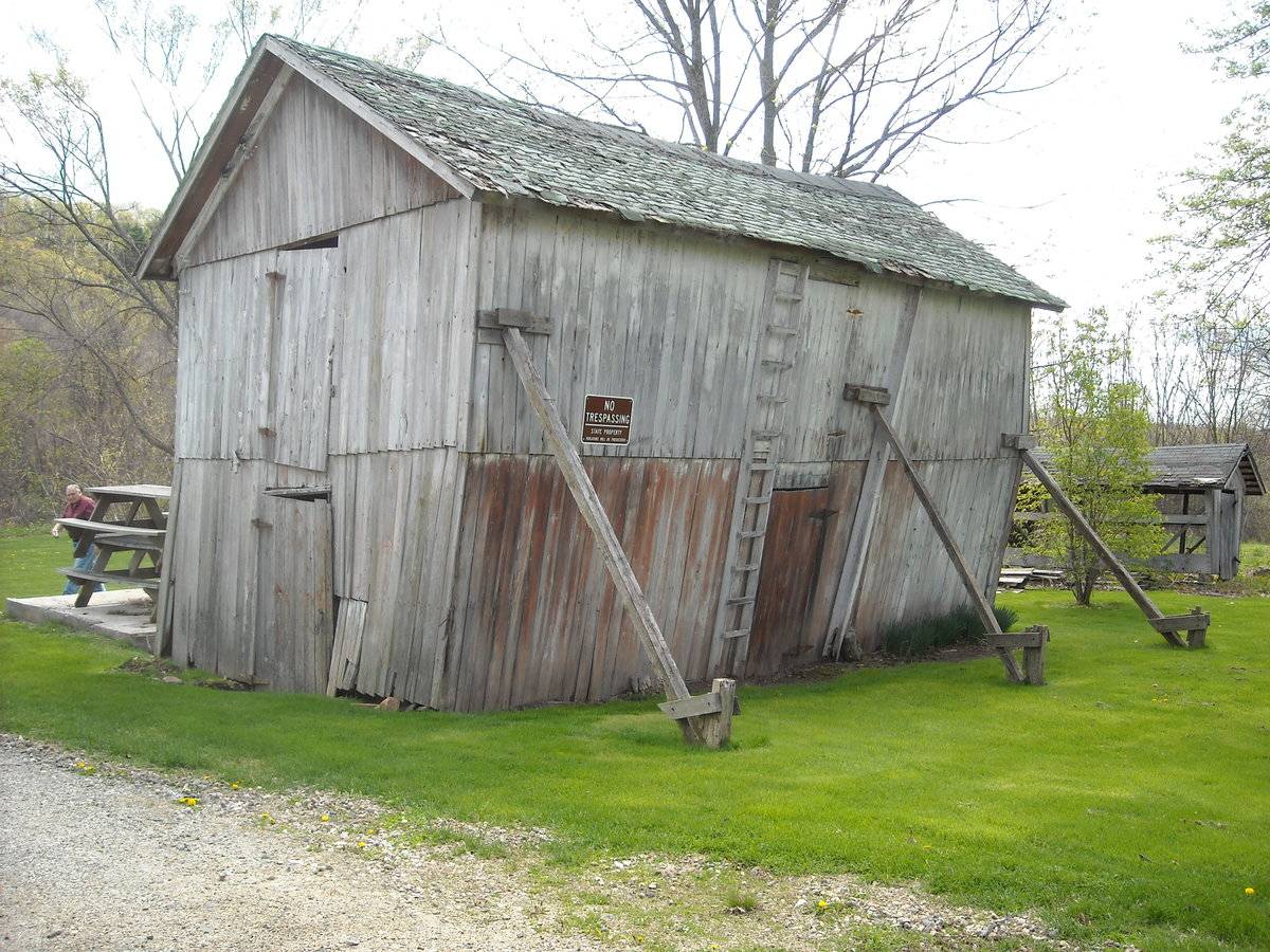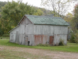 The oldest barns still found in the state are called the “English Barn,” “side-entry barn,” “eave entry,” or a 30 x 40. They are simple buildings with rectangular plan, pitched gable roof, and a door or doors located on one or both of the eave sides of the building based on the grain warehouses of the English colonists’ homeland. The name “30 by 40” originates from its size (in feet), which was large enough for 1 family and could service about 100 acres. The multi-purpose use of the English barn is reflected by the building’s construction in three distinct bays - one for each use. The middle bay was used for threshing, which is separating the seed from the stalk in wheat and oat by beating the stalks with a flail. The flanking bays would be for animals and hay storage.