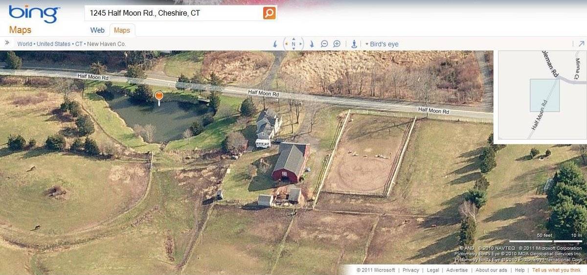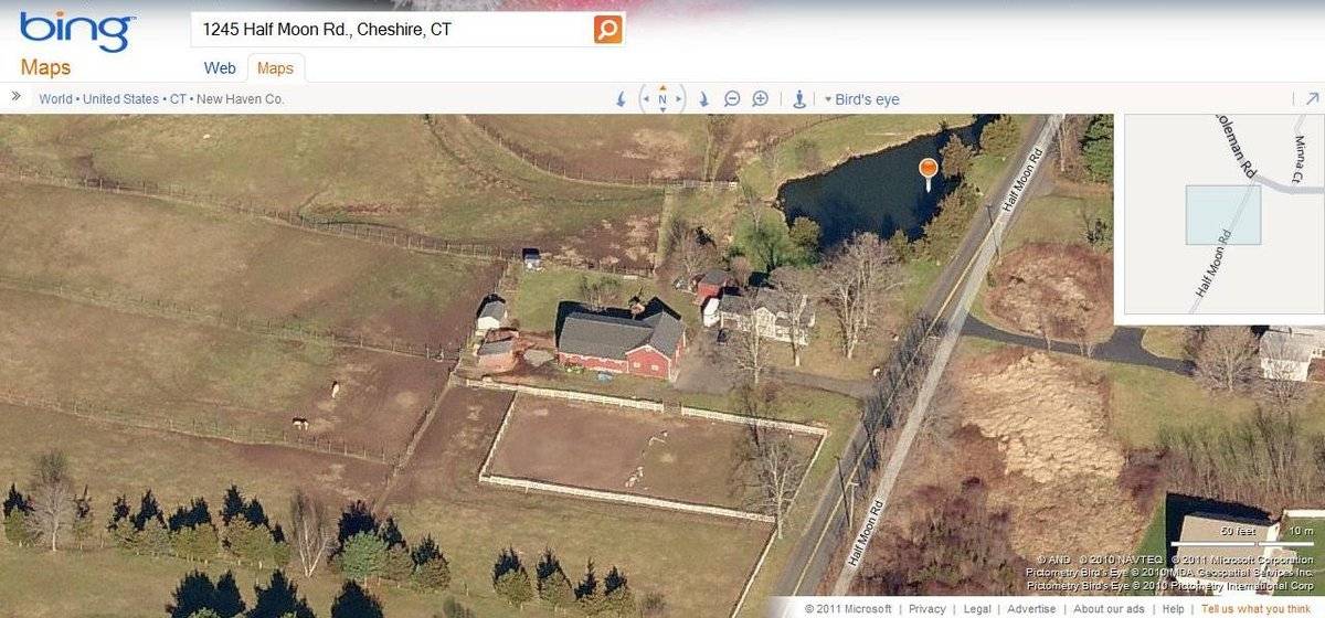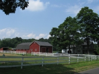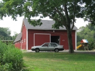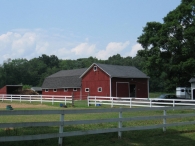 This is a 1 ½ -story three-bay gable-roofed barn structure with a large gambrel-roof addition. The barn is oriented with its ridge-line north-south parallel to Half Moon Road, which runs northeast to southwest. The main entry is a sliding barn door hung on an exterior track in the center of the east eave-side of the barn. Located to the right (north) of the sliding barn door is a small red sign with white lettering reads “Half Moon Farm.” Located on the south gable-end of the barn are two equidistant stable window openings. A window opening is located in the gable attic of the south gable-end of the barn. Encompassing the west eave-side of the barn is a large gambrel-roof addition extending west. Located on the south eave-side of the gambrel-roof addition are four equidistant stable window openings. The west gable-end of the gambrel-roof addition appears to have a sliding barn door located in the center on the main level and a hay door located in the gable attic. The north eave-side of the gambrel-roof addition has four equidistant stable window openings. Located on the north half of the north gable-end of the main barn is a window opening. A window opening is located in the gable attic of the north gable-end of the barn. The barn and addition have vertical flush-board siding painted red with the opening trim and corner boards painted white.