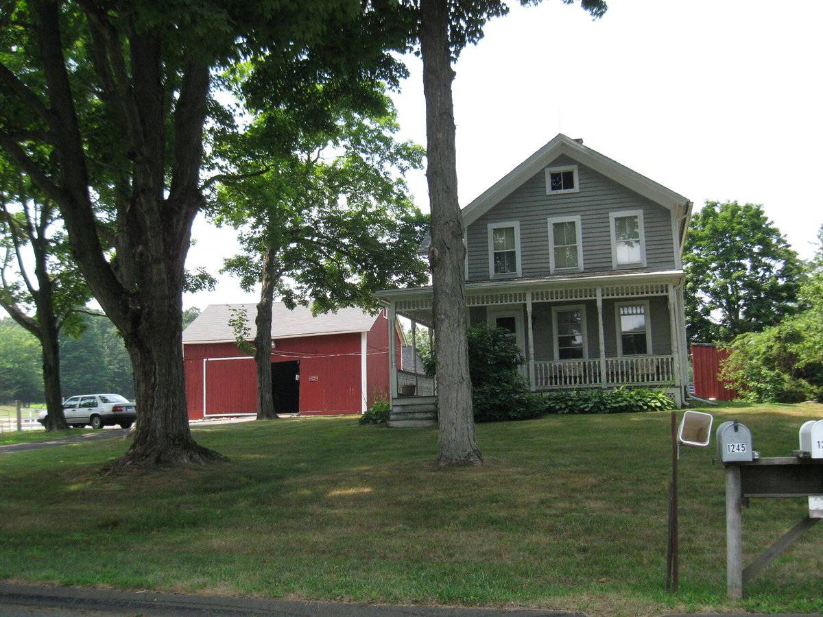 The barn is to the southwest of the c.1849 Greek Revival-style house it is associated with. The ridge-line of the house is perpendicular to the ridge-line of the barn and to the road. To the north of the barn and house is a small pond and several fenced fields. To the west of the barn are two small outbuildings. Extending further west behind the barn are several fenced fields. To the south of the barn is a large corral. The total size of the site is 9.96 acres. The area surrounding the site is residential and woodland.