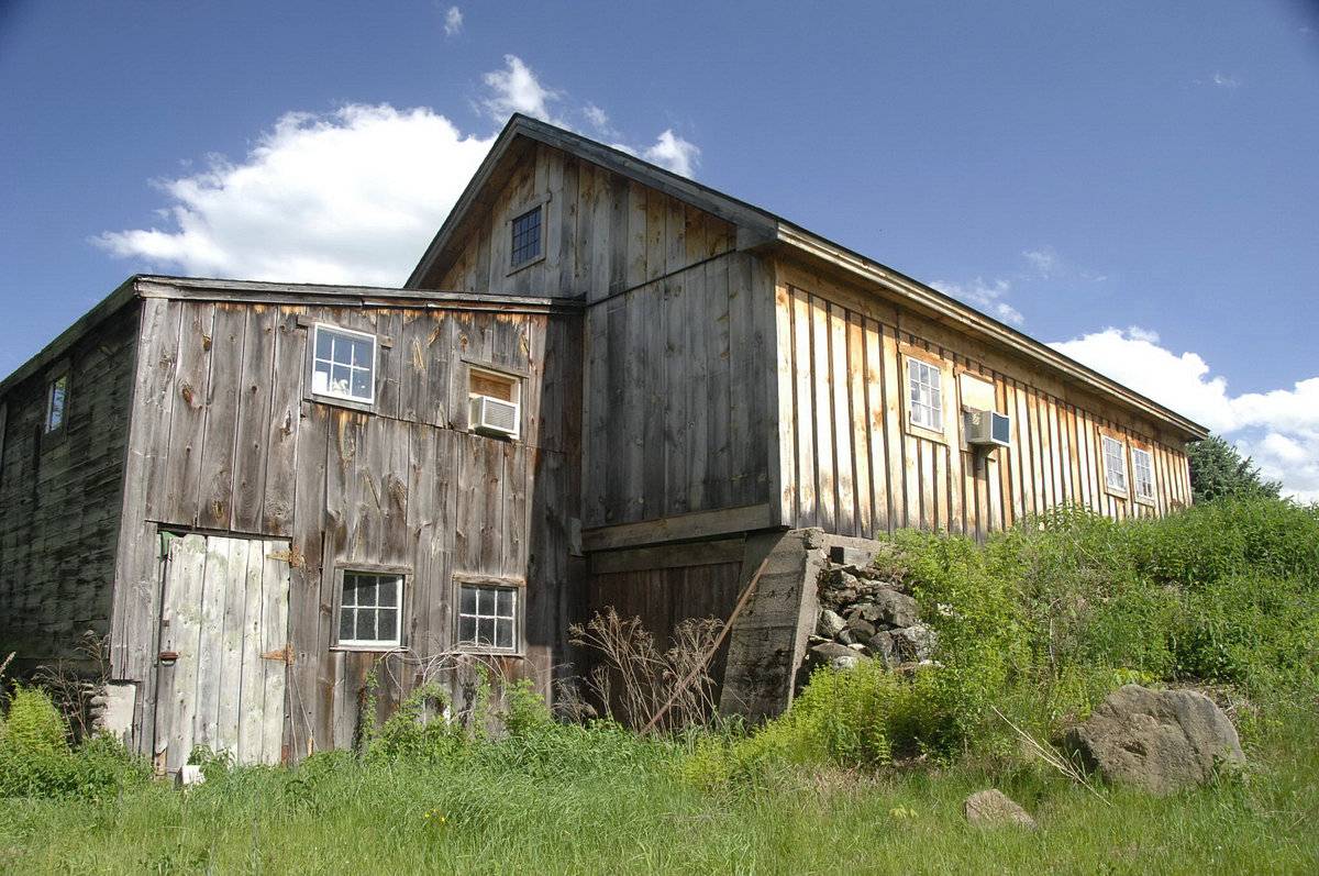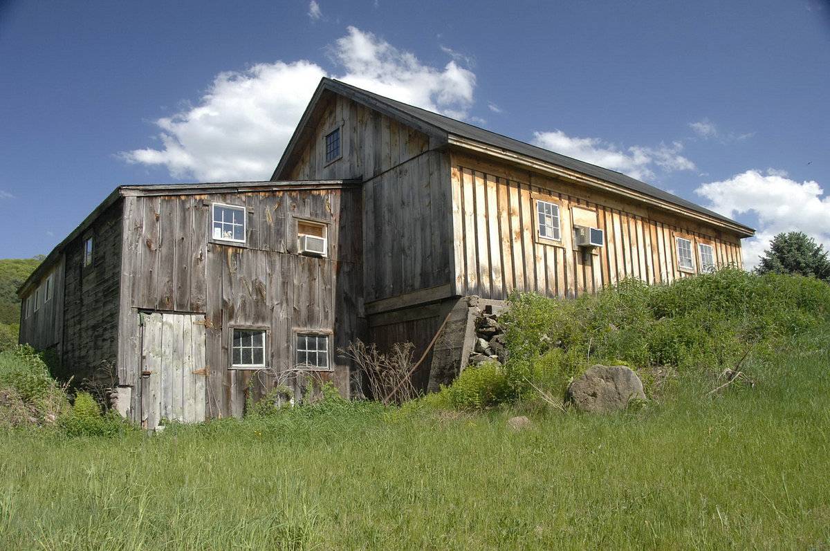 This is a 1 1/2 story, tripartite, side-entry, saltbox-roofed barn with a pair of back-to-back gable-roofed additions. The main facade faces roughly west and the ridge-line of the barn is perpendicular to this portion of Turnpike Road, which runs approximately southeast-northwest. The main entry is a pair of exterior sliding doors in the middle of three bays on the west eave-facade. The south bay has a framed pass-through door and the north bay has a slightly wider, framed, pass-through door. The south gable-facade of the barn has a pass-through door off center to the east. Centered in the gable attic is a window opening with trim. The north gable-facade appears blank. Extending to the west off of the west eave-facade is a saltbox-roofed addition. The sides of the addition are flush with the gable facades of the main barn. Extending south from the saltbox-roofed addition is a gable-roofed addition with a series of six-pane windows on both eave-facades. The west eave-facade also has an X-braced door. The walls of the eave-facades are concrete block masonry. Extending south from the addition is a second addition. The west eave-facade of the second addition is blank except for an X-braced door towards the north corner. The east eave-facade of the second addition has what appears to be four X-braced doors. The barn has unpainted vertical flush-board and board-and-batten siding. The additions have concrete block masonry walls. The roofs of the entire structure are asphalt shingles. A single cupola sits atop the ridge of the first gable-roofed addition.