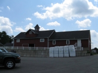 The south eave-side has a basement accessed from a lower grade level. The center and east bays on the basement level of the south eave-side of the western gable-roofed addition each have an overhead garage door. Three equidistant six-over-six double hung sash windows are located on the main level of the south eave-side of the gable-roofed addition. The south eave-side of the main barn structure has, at the basement level, from left (west) to right (east) a single pass-through door, and several overhead garage doors. A hood is located above door track. There appears to be a hay door flanked by small windows on the main level of the center bay of the south eave-side of the barn. This same type of configuration also appears to be on the second level of the center bay of the south eave-side of the main barn. The second level of east and west bays of the south eave-side of the barn each have a fifteen-pane fixed window.