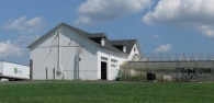 The south eave-side of the west addition has two overhead garage doors at grade and two small attic dormers at the west and east corners of the roof. Extending south off the south gable-façade of the main block of the barn is a large triple-arched greenhouse structure extending south.