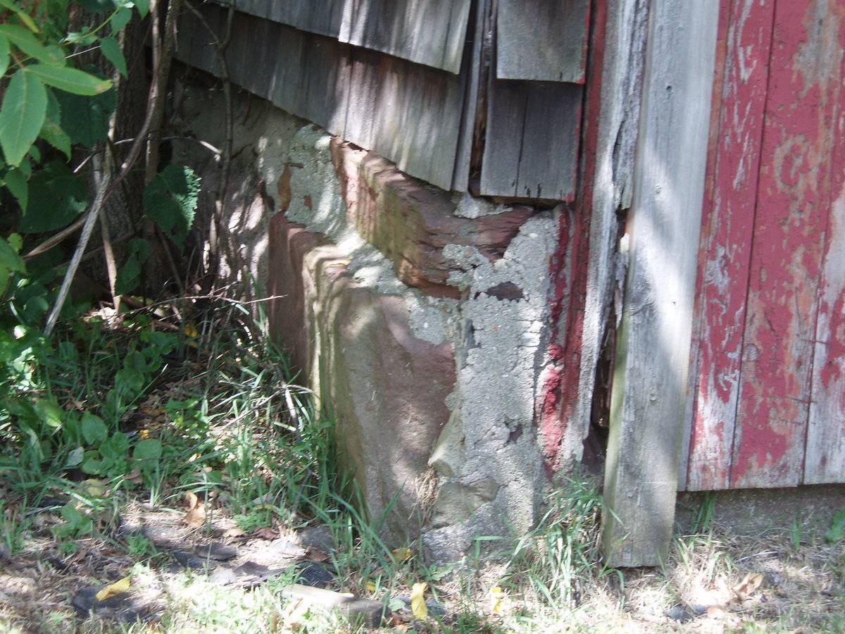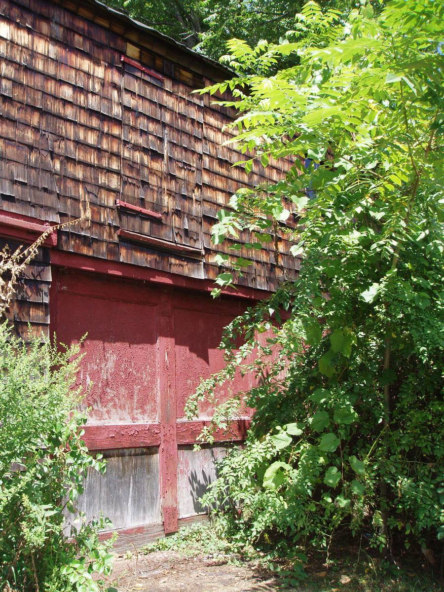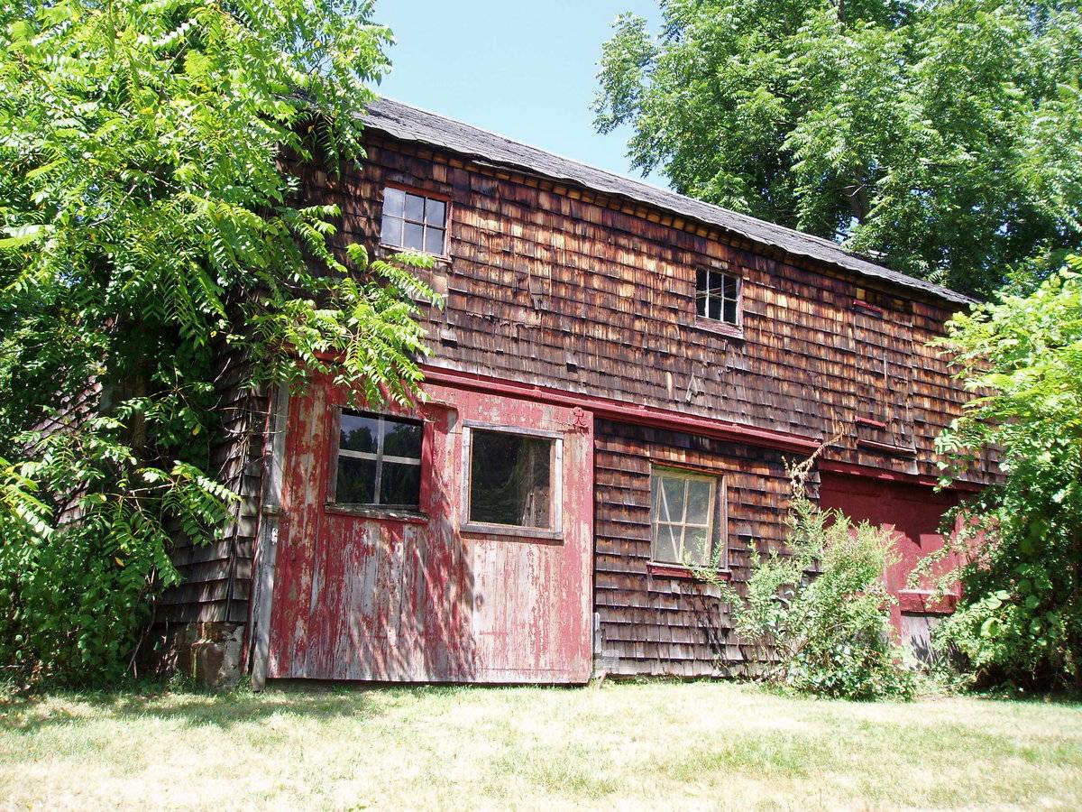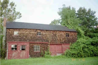 Owners had JUST bought this property; only lived in the 1980s house 2 days; no phone yet! Knew nothing about the barn except their realtor told them they were crazy to consider repairing the barn - "too costly & too much to be done to it." Barn is older than the house - Detached, situated well below the house on the rural, residential road. Siding is wood shingle, doors clapboard, foundation fieldstone, gable roof covered with rolled roofing. Guess is: it was a carriage & horse barn with apartment upstairs...although owner claimed "there is a loft" and a hay door can be distinguished. Surrounded by pasture land, and a few well-spaced houses.
