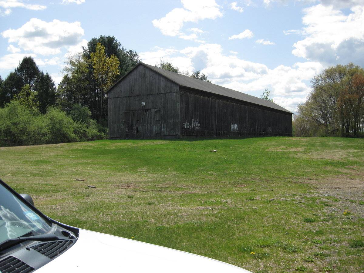 The tobacco barn, or shed as it is called in the Connecticut River Valley, is one of the most distinctive of the single-crop barns. They tend to be long, low windowless buildings with pitched roofs. They are characterized by vented sides to regulate air flow and allow harvested tobacco to cure at the appropriate rate. Derived initially from the design of the English barn, the shed is composed of a fixed skeleton consisting of two- or three-aisle bents repeated at intervals of 15 feet to the desired length. The wood-framed bents sit on piers of stone or concrete and the bents are connected by girts and diagonal braces. Typically there are two doors at each end, making the shed a “drive-through,” although some sheds are accessed through doors on the sides. The interior structural framework serves a second purpose in addition to supporting the walls and roof of the building; it provides a framework for the rails used to hang the tobacco as it cures.