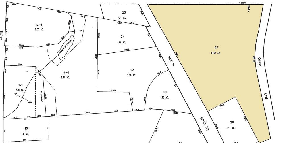 The 10.67 acres property, parcel number - C0054800 and map number 78, is towards the west of Cherry Lane and the east of Madison Road. It is located in a predominantly residential area of rural character with its edges defined by woodland. Residential plots can be seen towards the north, south and the west of the property, across Madison Road while parcels of farm land can be seen towards the east, across Cherry Lane.