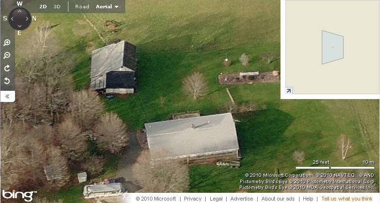 The barn is located in the south-west corner of the property offset from Cherry Lane. The circa 1989 ranch main residence is located towards the north-east of the barn, nearer to the road. The ridge line of the barn runs east-west almost perpendicular to the road while that of the main residence runs north-south. A few small gable-roof sheds can be seen scattered towards the east of the barn. The property has open land towards the north of the building complex while dense woodland covers the area towards the south.