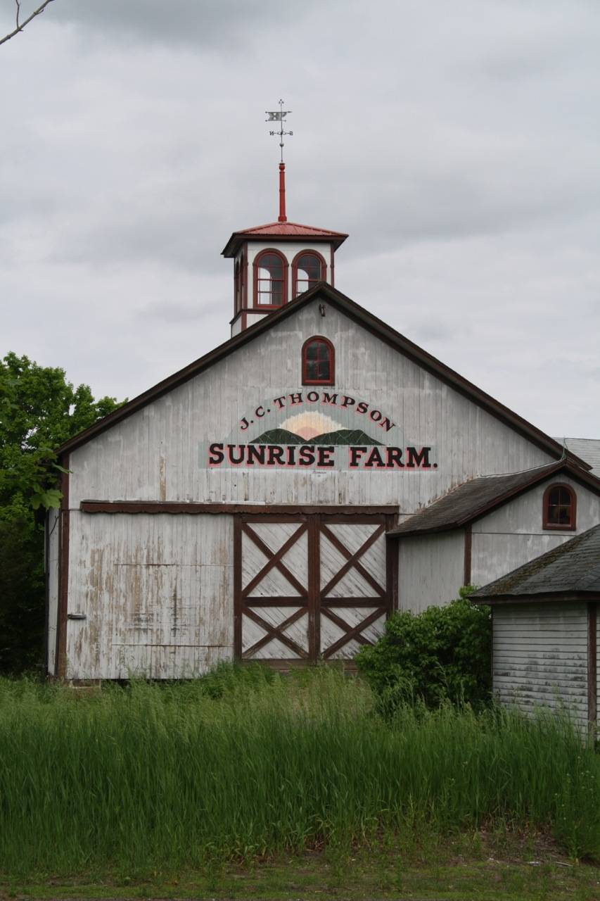 Barn I is a large 1 ½-story gable-entry barn on a raised basement with a gable-roof. The primary façade is the west gable-end, which faces West Avon Road. The main entry on this gable-end is an oversize wooden panel sliding door, mounted on an upper track, centered on the first story. Each panel features decorative X bracing on the exterior. The north half of this façade is blank. The south half is occupied by a westward projecting gable-roof addition (Addition IV). Centered over the main entry is a painted hilly landscape with the text “J.C. Thompson – Sunrise Farm”. An arched window is centered beneath the roof ridgeline within the gable-attic, above the landscape and text. An eight-pane horizontal foundation window is located in the northern half of this façade. A mortared brownstone foundation appears to constitute the foundation on this end. An earthen ramp leads up to the main entry. The north eave-side of the main barn is blank.
