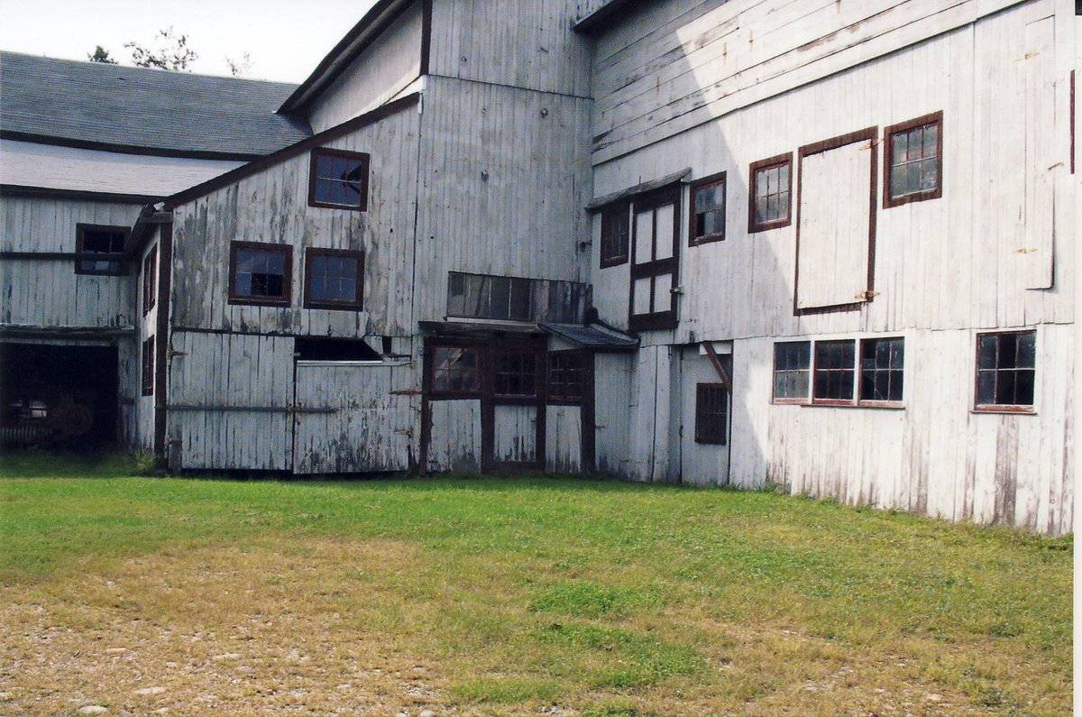 Addition IV is a 2 ½-story hipped-roof addition running perpendicular to and projecting south from the south eave-side of the main barn. This addition has a long and skinny footprint, and is subservient to the much larger Addition V, to which Addition IV attaches on its east eave-side. The north gable-end of Addition IV adjoins the south eave-side of the main barn. The east eave-side contains an oversize sliding wooden door in the northern half, mounted on an upper track. Two six-pane windows are located above this door on the first-story. The southern half of the east eave-side appears to be blank on both stories. The south gable-end contains a modern pass-through type door on the basement level. The first story is blank.