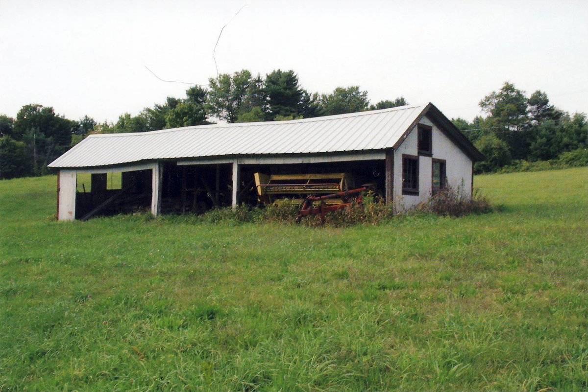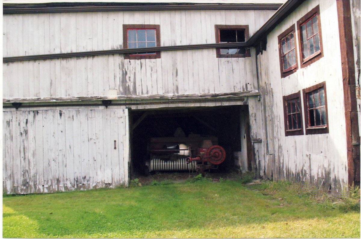 The agricultural structures on this site are set well back from the road and may not be clearly visible. The farmhouse associated with this property is located to the immediate southwest of Barn I. A line of tall coniferous trees is located between the house and the road in the front yard. An asphalt driveway passes along the north side of the house, which then divides, with one leg arcing north to the main entry of the main barn, and the other leg arcing south around the south side of Addition V. Several additional smaller outbuildings are located on the property, including two small sheds to the south of Addition V, a shed to the west of the main barn, and a wagon shed to the northeast of Barn III. Several trees surround the house and shed immediately in the vicinity. A small creek flows to the east from southeast of Barns II & III, flowing into a small river which passes along the east side of this property. Agricultural fields surround the barns to the south, east, and north, as far as Thompson Road, which is the northern boundary. Dwellings line the north side of Thompson Road and the west side of West Avon Road. Woodlands are intermixed with the houses and also are present beyond the fields to the south and east.