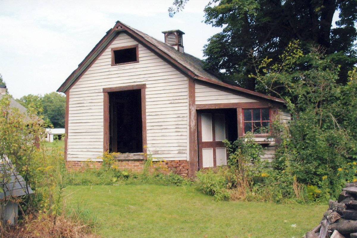 Addition II is a small 1-story shed-roof addition projecting to the east from the east gable-end of Addition I, in the northeast corner. The north eave-side appears to have three evenly-spaced small window openings spread along the length of this side. The east end of this addition includes a wood-plank pass-through door at the southeast corner. The south eave-side includes a paired six-pane window arrangement at the southeast corner, with a sliding pass-through size door to the immediate west, mounted on an upper track, with a six-pane window mounted within. The western half of the south eave-side includes a single six-pane window to the immediate west of the door, a short gap, and a run of four six-pane windows. This addition appears to have a concrete foundation.