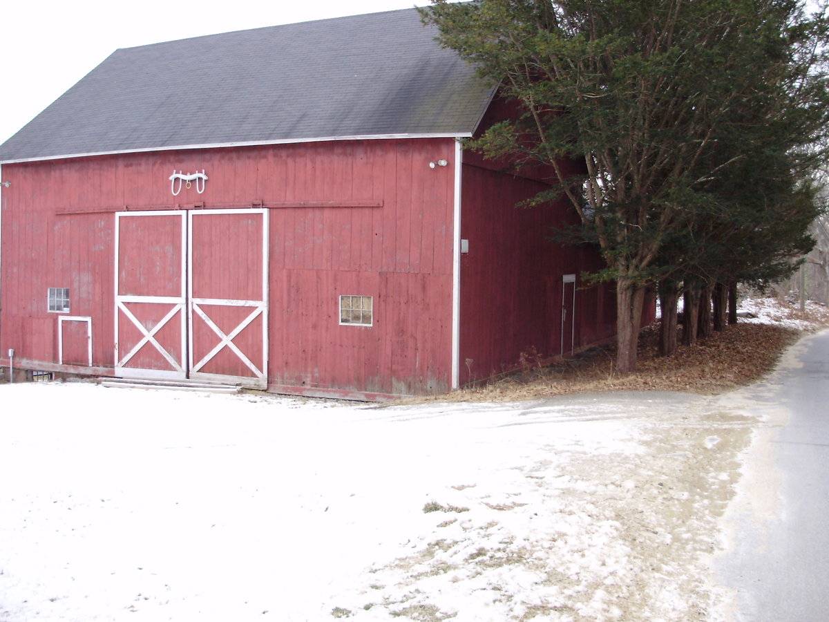 The three-unit inverted U-shaped barn complex is located along the western edge of the property abutting to Pond Meadow Road. The ridge line of the main barn runs east-west perpendicular to the road. The circa 1850 colonial main residence of the property is located towards the north of the barn complex with a rectangular swimming pool towards its immediate northeast. The property has a garden with stone walls and open land towards the east of the main residence with dense woodland towards the south. Vincent Pond is located in the northeast corner of the property.