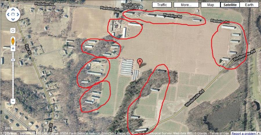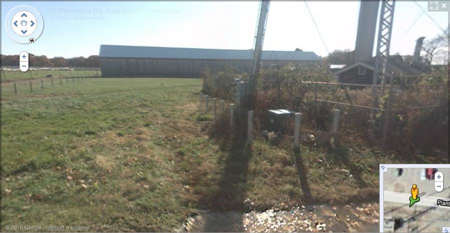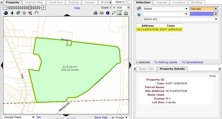 The approximately 158.4 acres property (0.25 square mile), Map number - 40 50 001, is a corner plot towards the south of Plantation Road and the north-west of Windsorville Road, situated in a residential area of rural character. Parcels of open land with active farming can be seen towards the north of the property across Plantation Road while residential plots can be seen along towards the west. A single residential plot can be seen along the northern edge of the property. Dense woodland surrounds the property towards the south and the south-west while parcels of farm land can be seen towards the south-east, across Windsorville Road.