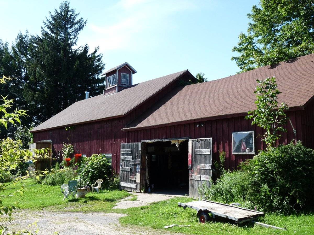 The barn is located towards the eastern edge of the property with its ridge line running east-west perpendicular to East Street North. The circa 1830 main residence is located towards the south of the barn while a small gable-roof shed can be seen towards its southwest. Cluster of trees can be seen towards the immediate west and the northeast of the barn, separating it from East Cemetery. The property has open land towards west with dense woodland demarcating the edges.