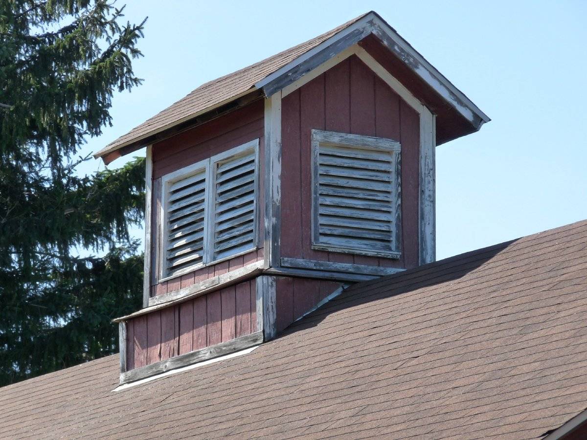 The wooden frames of both the main barn and the gable-roof addition have asphalt shingle roofing. The main barn has red painted vertical siding walls while the gable-roof addition has red painted board-and-batten.