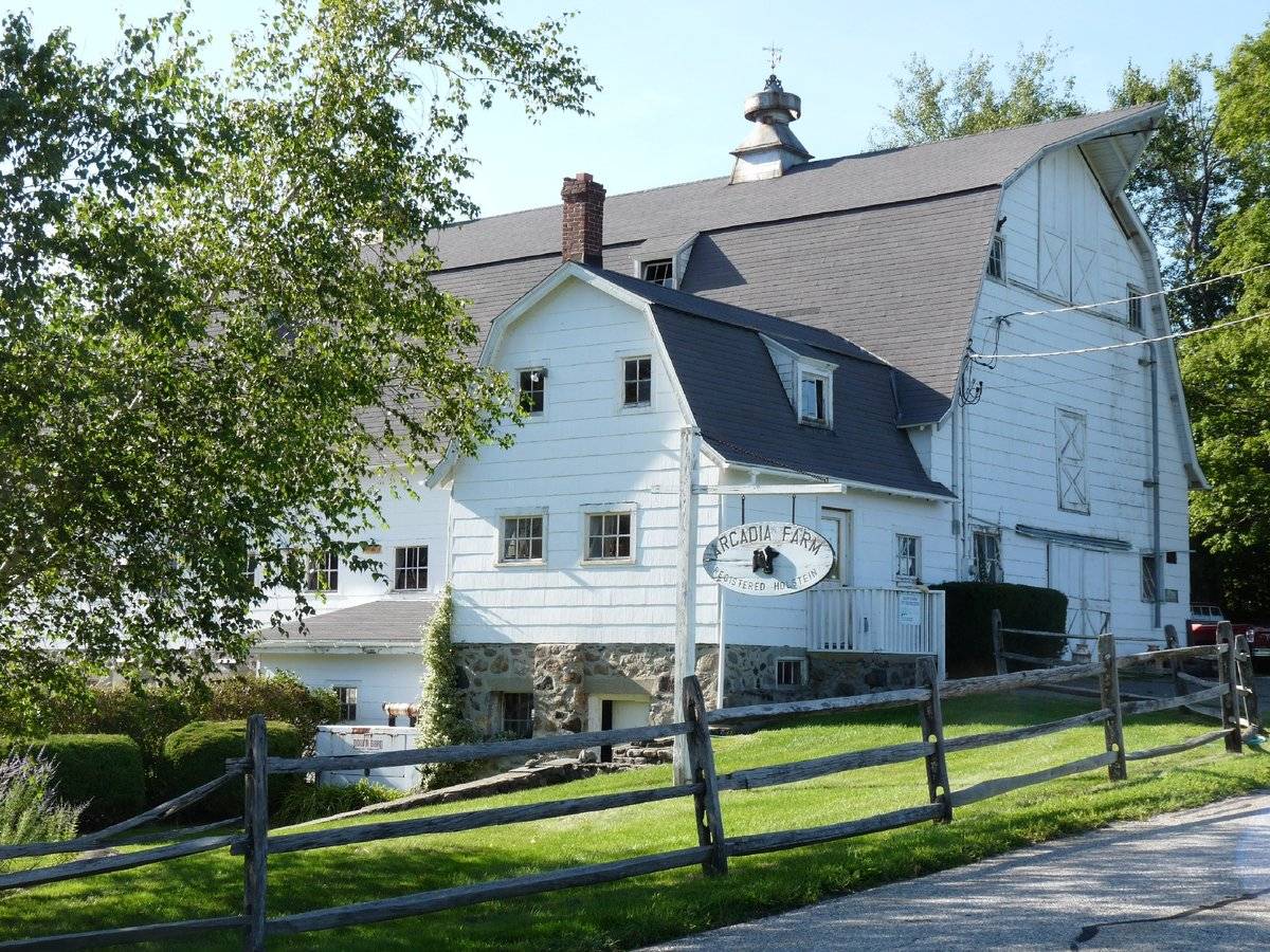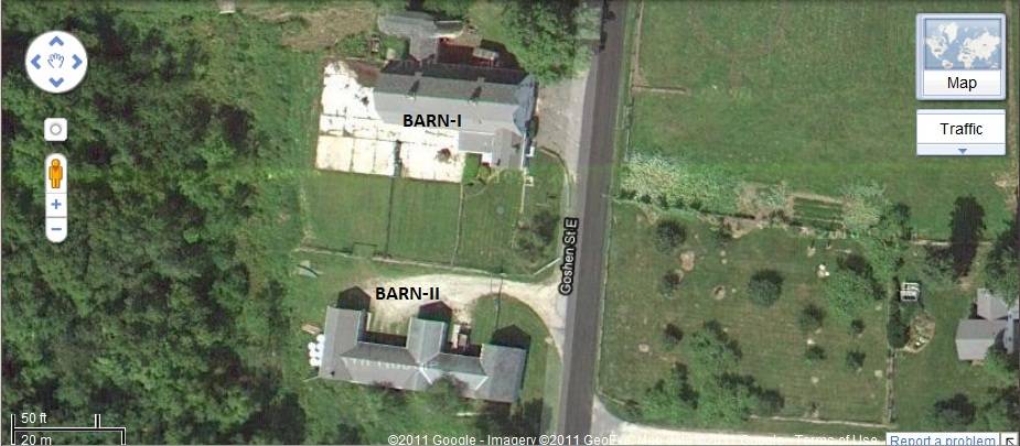 The two barn complex is located in the northeast corner of the property abutting to Goshen Street East. The dutch-gambrel roof bank barn, Barn-I is located towards the north while the E-shaped cross-gable roof, Barn-II, is located towards the south. The ridge lines of both the barns run east-west parallel to the road. The two barns are separated by timber fence work while dense woodland covers the area towards the west and the south. A sign board displaying the name of the farm as ‘ARCADIA FARM: Certified Holsteins’ can be seen towards the southeast of Barn-I.