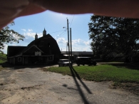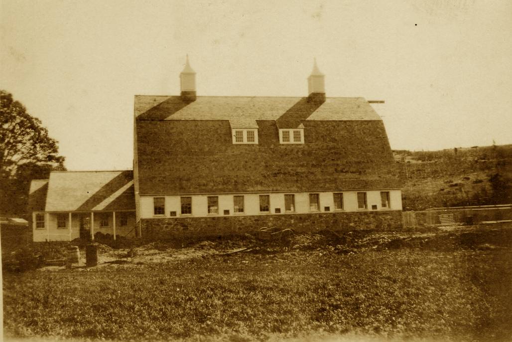 The walls of the barn and additions are covered with several different materials. The original barn and the majority of the additions and various wings are covered with clapboard siding painted red, with white trim. The main façade of Addition II appears to be clad with mortared cobblestones. The roofs of the original barn and its additions to the east are covered with asphalt shingles. Additions V and VII are covered with flat-seam metal roofs. Additions VI and VIII are covered with asphalt shingles. The gambrel roof of the original barn features two cupolas with louvered vents and hip roofs, one on its northern half at the ridge-line, the other located on its southern half, also at the ridge-line. On the center of the roof at the ridge-line of Addition II is a metal ventilator. To its north is a stone chimney. A second chimney that appears to be constructed of mortared concrete blocks is visible on the eastern half of the main façade of the original barn. The foundations appear to be a combination of concrete and mortared fieldstone.