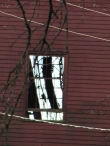From east to west along the main façade, beginning at the east corner of the 1 1/2-story gable-roof addition (Addition II), is a one-over-one double-hung window with trim, followed by a pass-through door. On the western half of the main façade of Addition II appears to be a second pass-through door. Below the apex of the gable on the main façade of Addition II is a louvered vent. Proceeding further west, there are three six-pane stable windows with trim across Addition I on the main façade of the original barn. Above the westernmost window is a small, shed-roof awning supported by two braced posts. In the center of the gable-attic of the original barn appears to be either a window opening or a hay door opening. Below the apex of the gable on the south gable-end of the original gambrel-roof barn is a large hay loft opening.