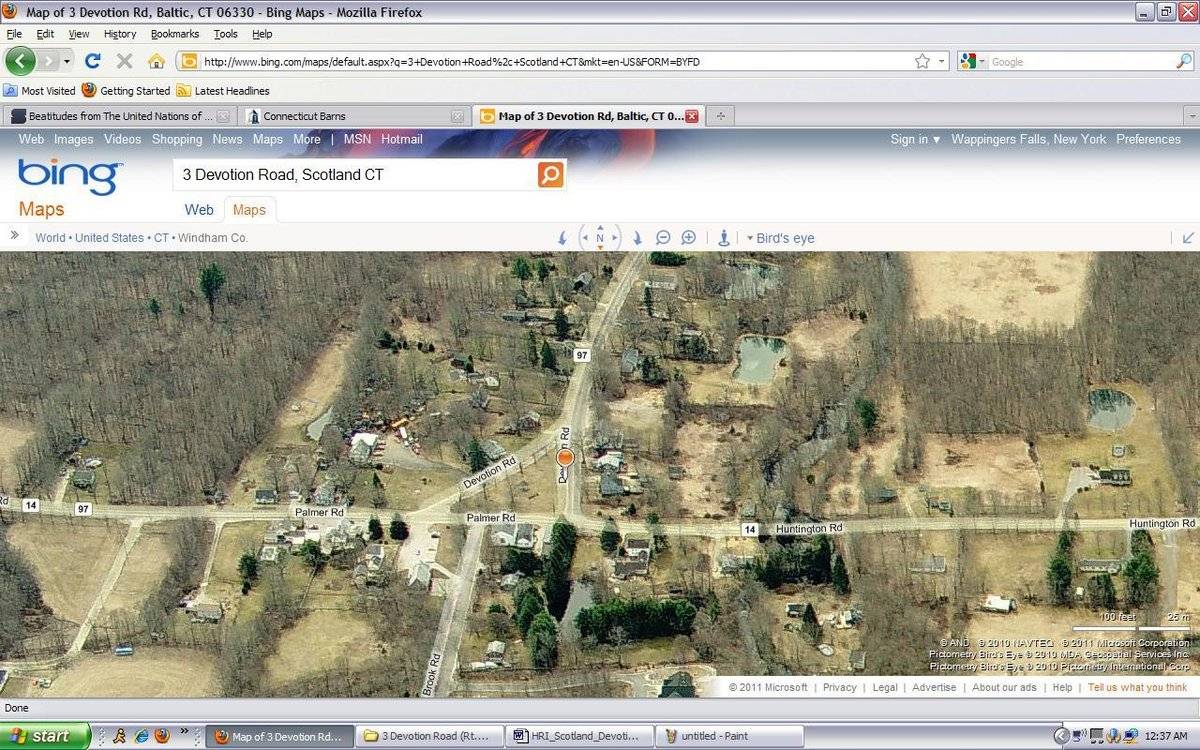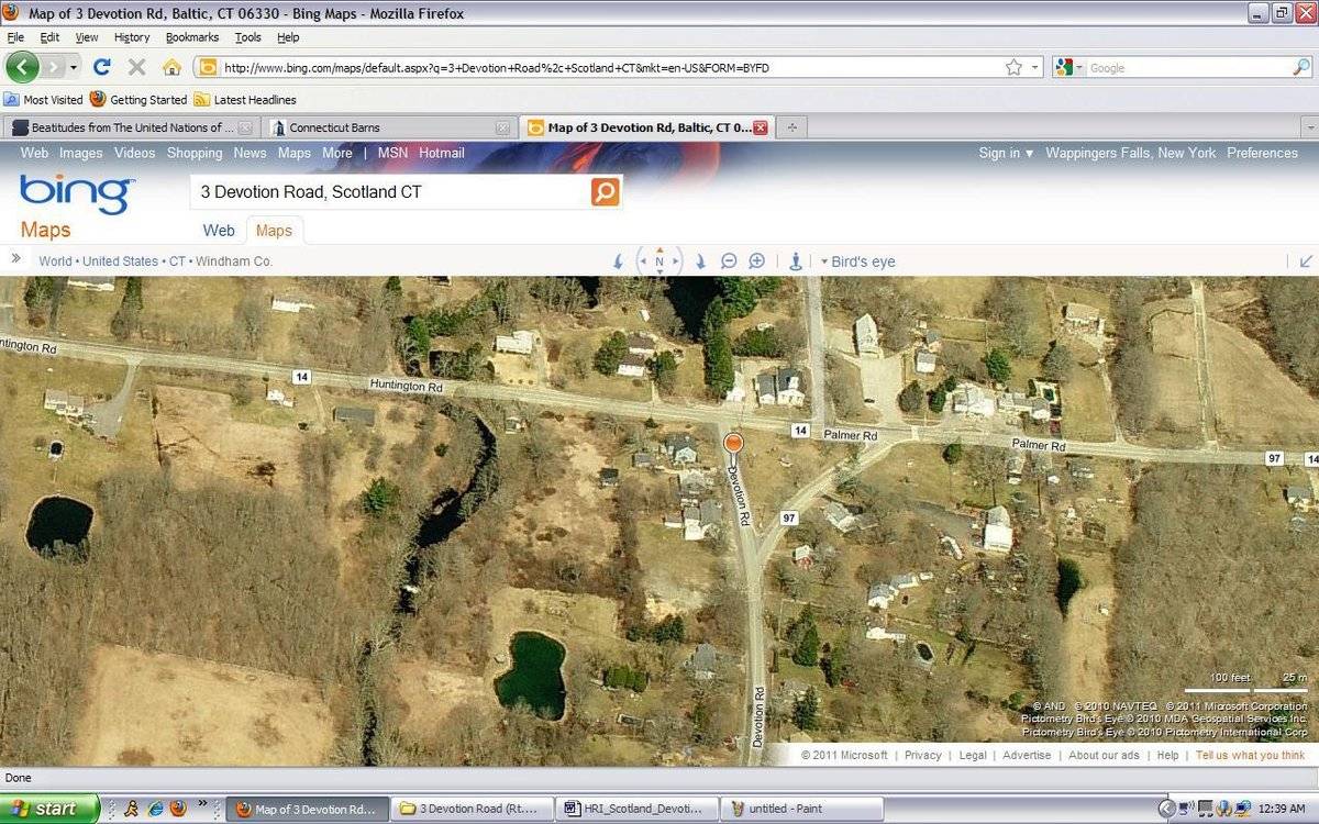 The property is on the west side of Devotion Road, south side of Rte. 14. The caretaker said that the house is 250 years old, and the barn not quite as old. The barn is visible from Rte. 14, and also from the driveway of the property.