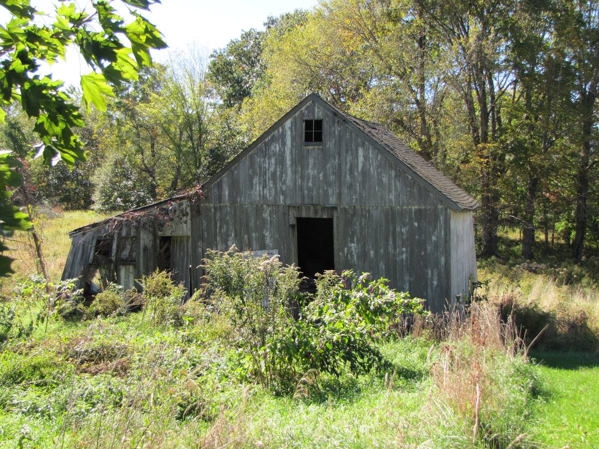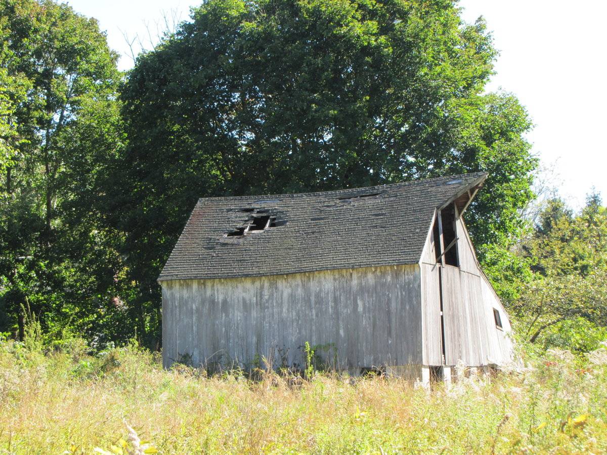 This is a 1 ½-story gable-entry bank barn with a gable-roof and a shed-roof addition extending the entire length the south eave-side of the barn. The main gable-end façade faces east and appears to be at grade, with the ground sloping gradually away to the west. The ridge-line runs east-west, parallel to Huntington Road (CT 14), which lies to the north. Principal entry is provided by a pass-through door opening located in the center of the east gable-end. The door itself appears to be missing. Below the apex of the roof on is a four-pane stable window. To the south, along the main façade of the shed-roof addition is a hinged pass-through door constructed of vertical wood boards. To its south are two window openings, one of which is covered with plywood.