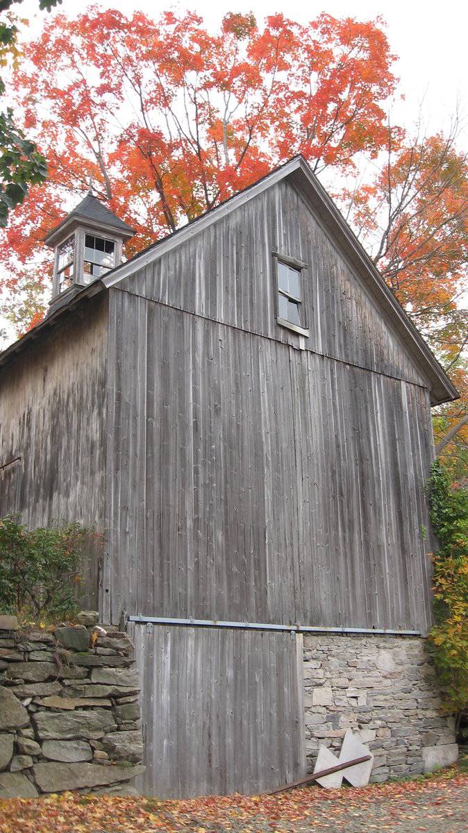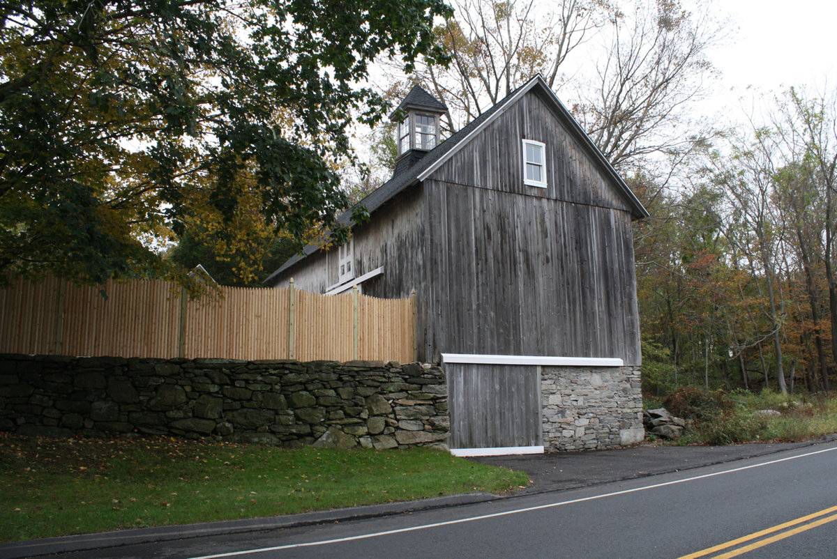 This English bank barn is next to and to the north of the house it is associated with, separated by a grave driveway. The ridge-line of the house is perpendicular to the ridge-line of the barn. The site is approximately two acres with a cluster of 5 outbuildings to the west and north of the house, demarcated by stone walls. The outbuildings include a summer kitchen to the west of the house, an English bank barn to the west of the summer kitchen, an L-shaped wagon barn which is to the southwest of the barn described here and a small chicken coop just west of the wagon barn. To the west of the complex is dense woodland that was once open fields. The area surrounding the site is residential, commercial and woodland.
