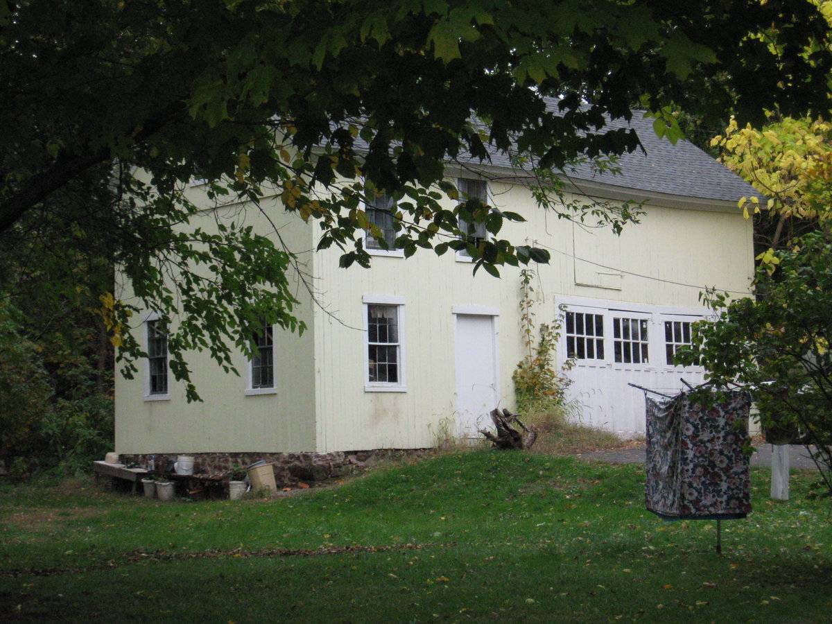 This is a three-bay 2 ½-story gable-roofed structure with its ridge-line oriented east-west and the main entrance in the south eave-side which faces the front of the lot and Berlin Avenue. In the left bay of the south eave-side there is one six-over-six double-hung window and a pass-through door at grade level, and two six-over-six double-hung windows at the second floor level. The center bay has a pair of hinged doors swinging out, with eight glazed panes above four vertical panels. A similar pair of doors is in the right (east) bay. Above the center bay doors there is a single hinged hay door with wrought iron strap hinges.