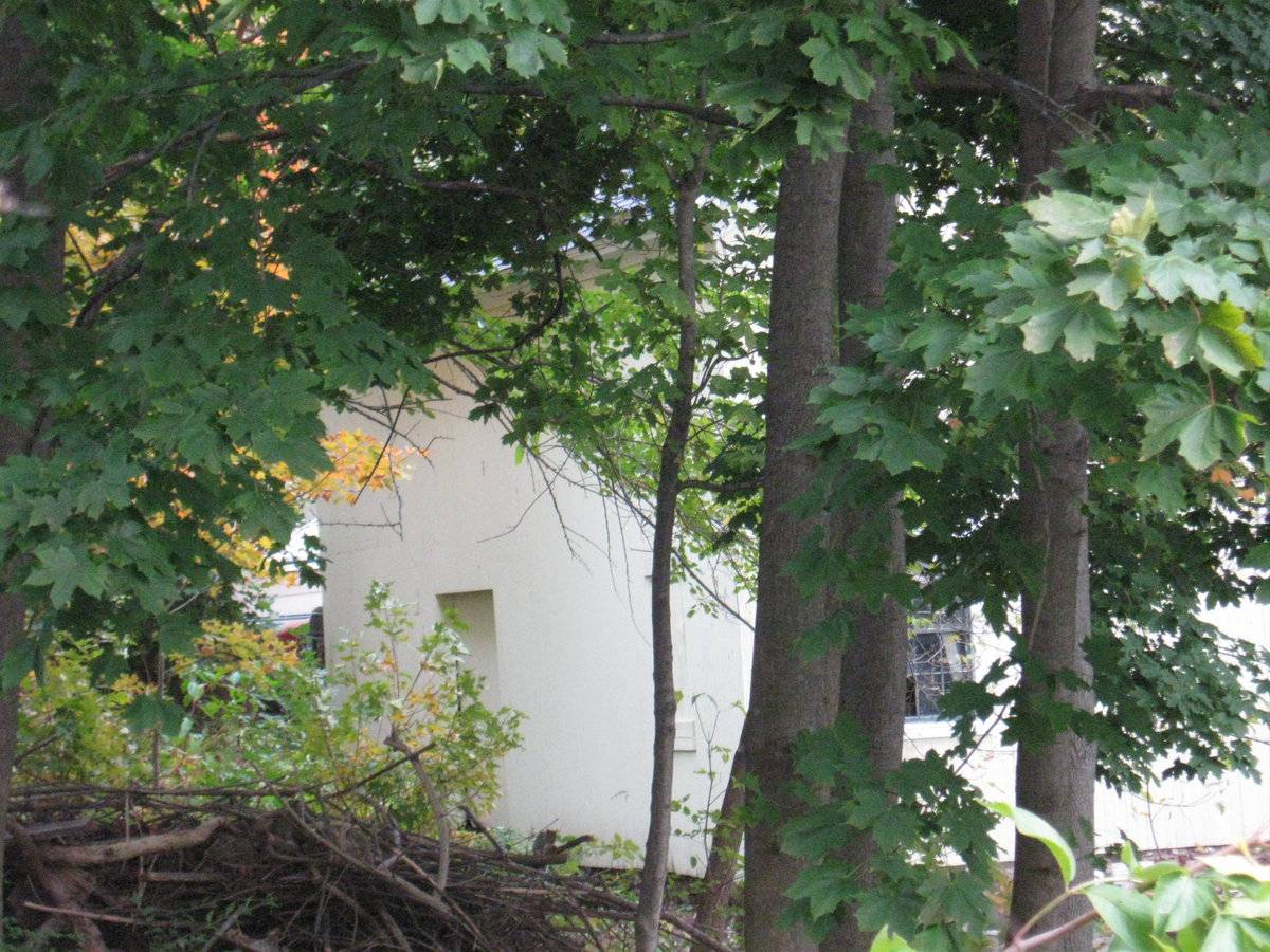 The west gable-end has two six-over-six double-hung windows at the ground floor level and one six-pane arch-topped window in the attic. The north eave-side has one pass-through door near the center of the ground floor. The east gable-end appears to have no openings.