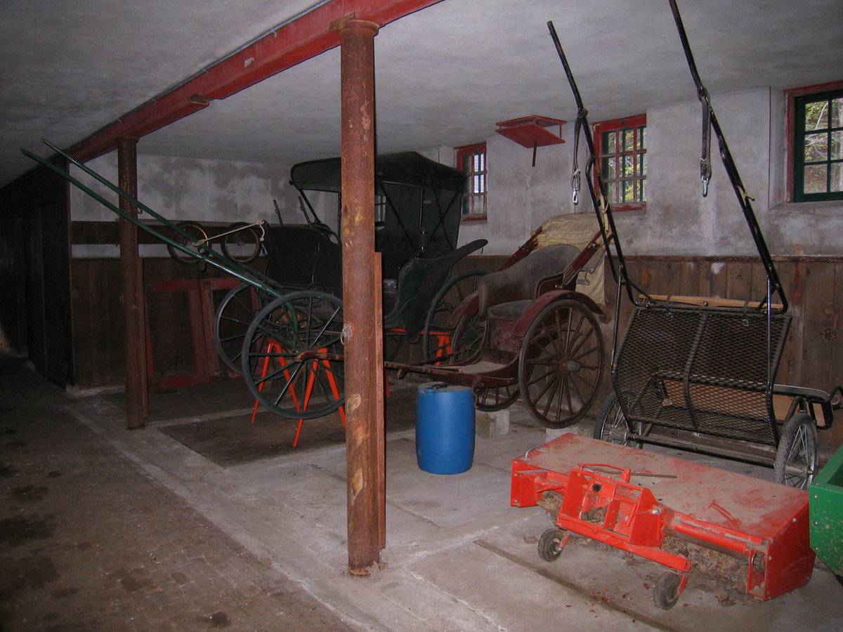 There are three additional barn structures located near the main barn. Located to the northeast of the main barn is a 1 ½-story gable-roofed barn with a gable-roofed addition. The gable-roofed addition extends to the south off of the south-gable end of the barn. Oriented with its ridge-line perpendicular to the ridge-line of the main barn, the main entry is a large garage opening on the south gable-façade of the gable-roofed addition. An exterior light fixture is located over the garage door. The west eave-side of the gable-roofed barn has a single pass-through door and window located on the south half and a pair of windows located on the north half. The barn has unpainted vertical siding. The roofs have a projecting overhangs and asphalt shingles. A monitor is located in the center of the ridge-line of the gable-roofed barn. Located to the southeast of the main barn is a 1 ½ -story gable-roofed barn with a shed-roofed addition. Oriented with its ridge-line parallel to the ridge-line of the main barn, the main entry is an overhead garage door located on the west gable-façade of the barn. The garage door appears to be an eighteen panel door with a row of six-pane windows on the bottom portion of the upper half of the door. A shed-roofed addition extends from the west half of the south eave-side of the barn. A single pass-through door with a nine-pane window in the upper half is located on the west side of the shed-roofed addition. The west gable-façade of the barn and west side of the shed-roofed addition has unpainted vertical siding while the south eave-side of the barn and south side of the shed-roofed addition has fieldstone. The doors on the gable-roofed barn and shed-roofed addition are painted green. The roofs have projecting overhangs and asphalt shingles. Located to the southwest of the main barn is a 1 ½-story gable-roofed barn with a gable-roofed addition. Oriented with its ridge-line parallel to the ridge-line of the main barn, the main entry is an overhead garage door located on the east gable-façade of the barn. The garage door appears to be a fifteen panel door with two rows of five-pane windows on the bottom and center portions of the upper half of the door. A single pass-through door is located on the east half of the south-eave side of the barn. A six-over-one double hung sash window is located in the center of the south-eave side of the barn. The gable-roofed addition extends to the south off of the west half of the south eave-side of the barn. The east eave-side of the gable-roofed addition has a six-over-one double hung sash window. The barn has unpainted vertical siding except for the south gable-end of the gable-roofed addition on the main level which is fieldstone. The doors are on the gable-roofed barn are painted green. The roofs have projecting overhangs and appear to be asphalt shingle.