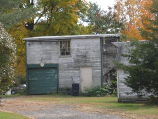 Small chicken coop (probably) in yard.