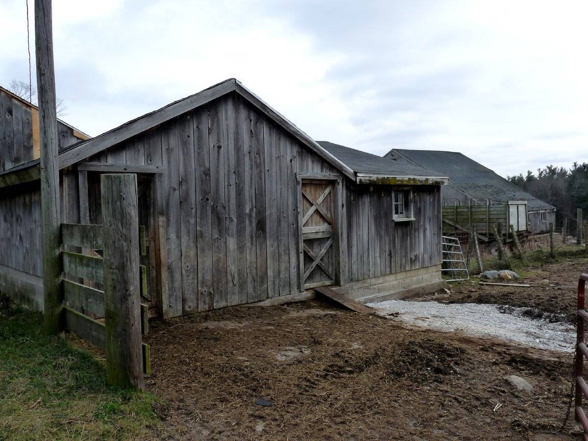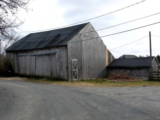 The wooden frame of the main barn is supported on cement plastered masonry foundation while the addition with the cross-gable roof is supported on concrete block masonry foundation. Both the main barn and the additions have grey painted vertical siding and asphalt shingle roofing.
