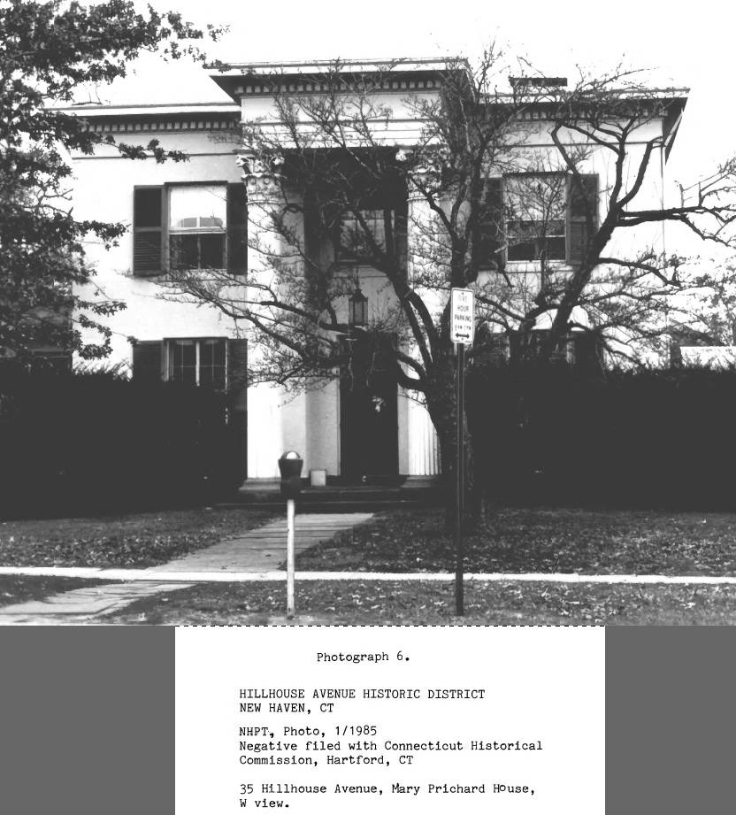 House is a Contributing Resource in the Hillhouse Avenue Historic District 244-365-3 35 Hillhouse Avenue (Contributing) Built: 1836. Mary Prichard House. Architect: Alexander Jackson Davis. Builders: Ira Atwater and Nelson Hotchkiss. 2-story brick and stucco Greek Revival-style residence. Notable features include 2-story distyle front portico with fluted Corinthian columns and slightly recessed front entry bay. Original antefixes around portico roof edges removed. Unobtrusive later additions to side and rear elevations. Photo No. 6