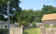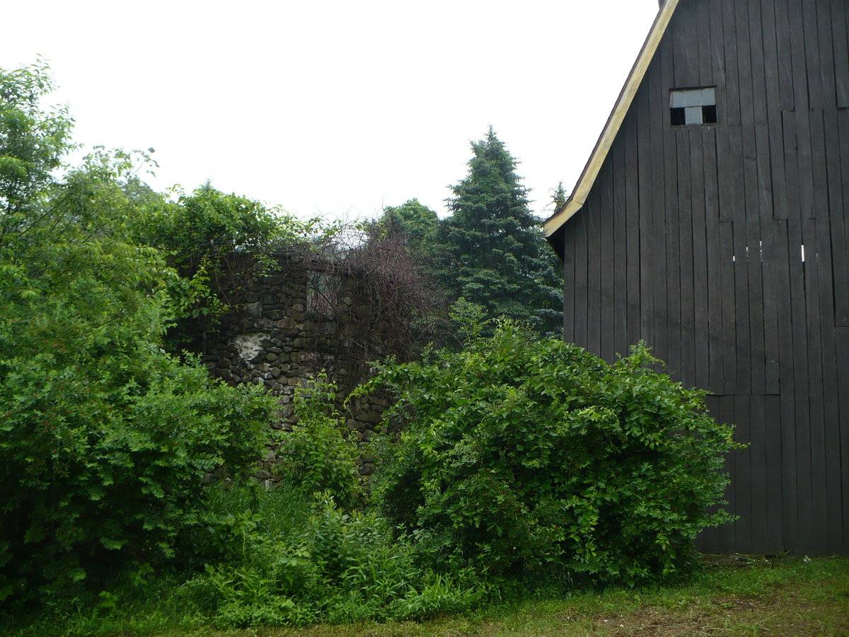 The pair of barns at this site are in close proximity to eachother and Main Street. The farmhouse associated with this property is situated just to the south of the barns, separated by a small grassy patch criss-crossed by gravel driveways. A mortared fieldstone wall extends from the southeast corner of Barn II toward Main Street, then curves around in front of Barn I parallel to Main Street to near the northeast corner of that barn, where it curves in again, parallel to the north eave-side of the barn. An iron gate in this wall is present near where it meets Barn II, and an opening in the wall is present facing Main Street near the southeast corner. The area within this stone wall is grass. A long garage is located to the southwest of the barns, and is the farthest extent of the gravel driveways. To the immediate north of Barn I are partially-remaining stone walls from an old silo. A large agricultural field extends to the north and west of the barns, wrapping around behind the garage, separated by a small stand of trees. Beyond the field to the west is the floodplain for a small river. A live of trees also serves as a wind break along Main Street right-of-way. Elsewhere, the streets surrounding this farm are lined with residences and shade trees.