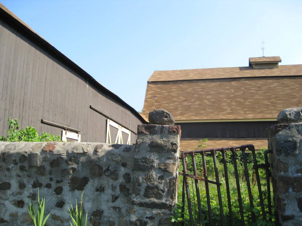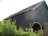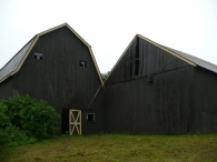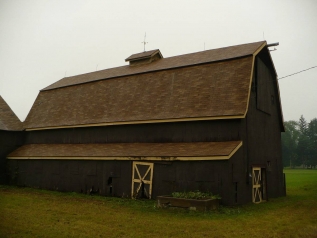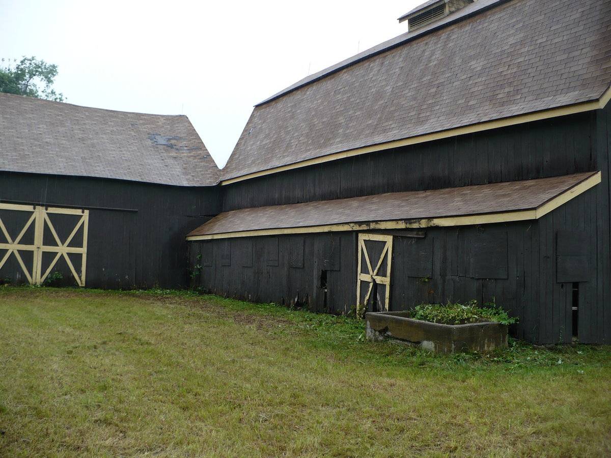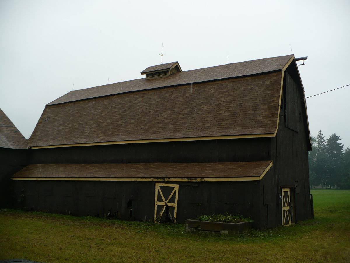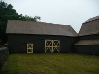 Both Barns I & II are sheathed in vertical wooden flush-board siding, painted deep brown. The trim along roof eaves and gable ends, where present, and the framing and bracing of all doors, is painted yellow. Both roofs are covered in brown asphalt shingles. A small monitor roof projection is present at the center of the length of Barn I’s ridgeline with long louvers down the eave-sides. This has a gable roof of the same roofing material and a weathervane at the ridgeline. Barn I’s gambrel roof also has flared eaves.