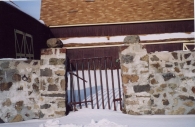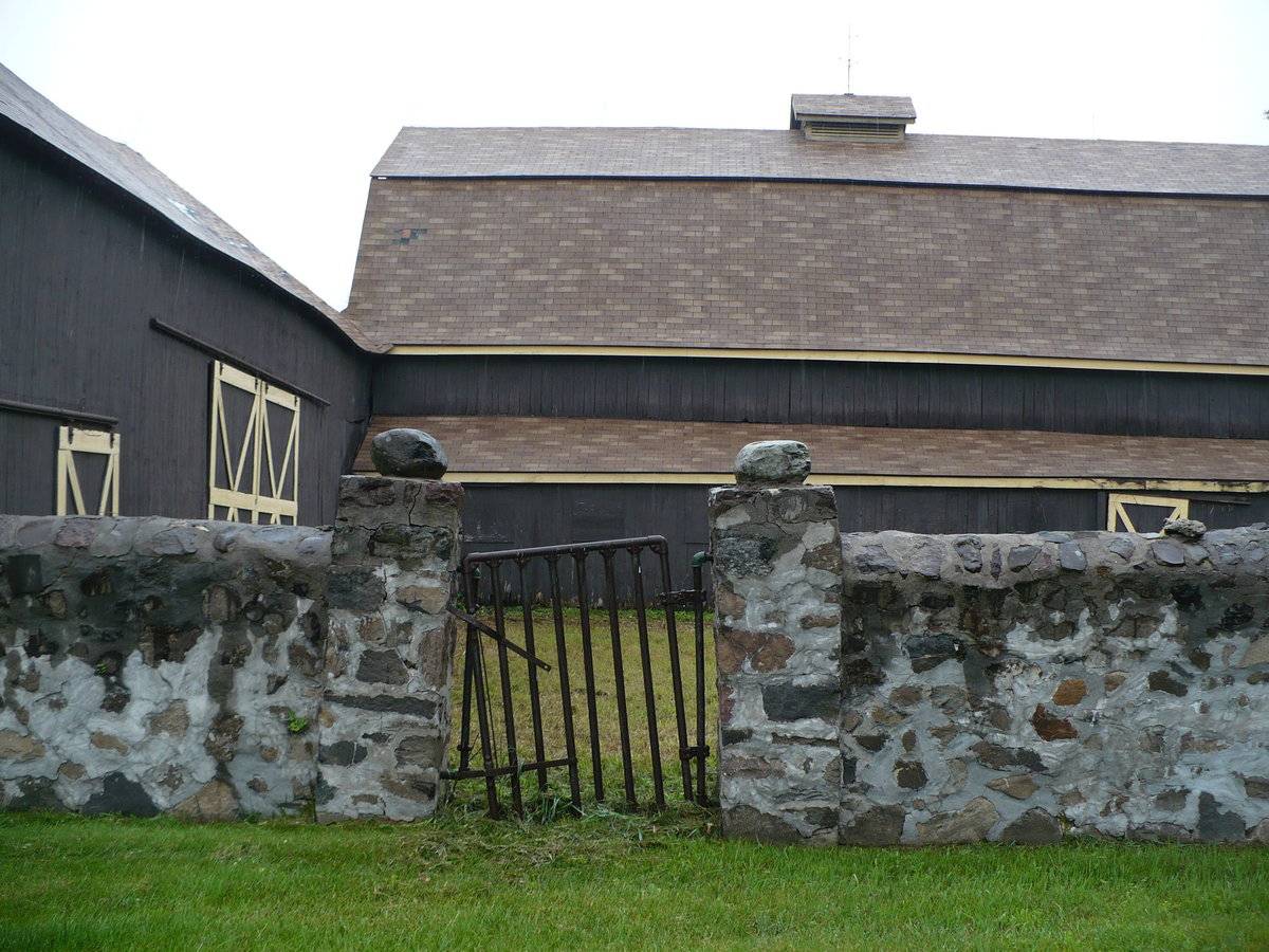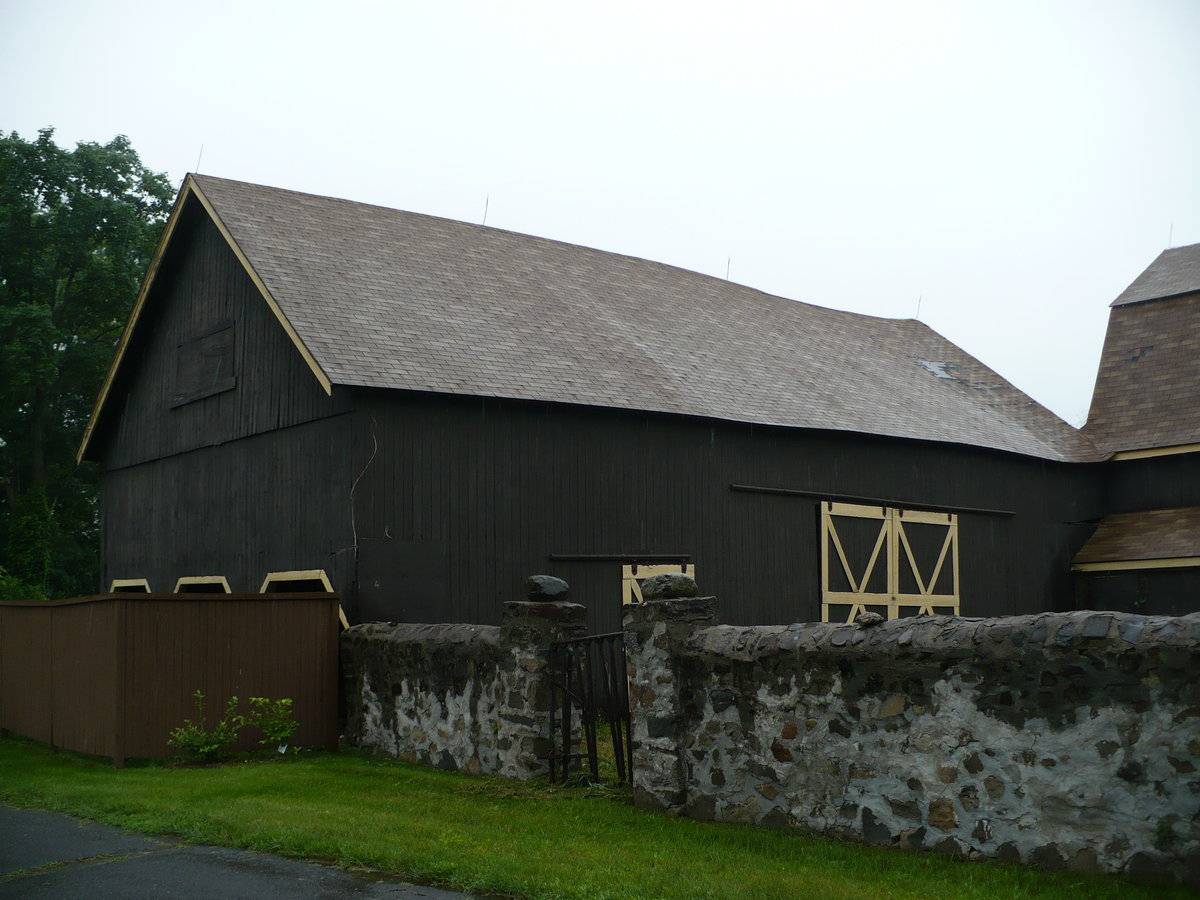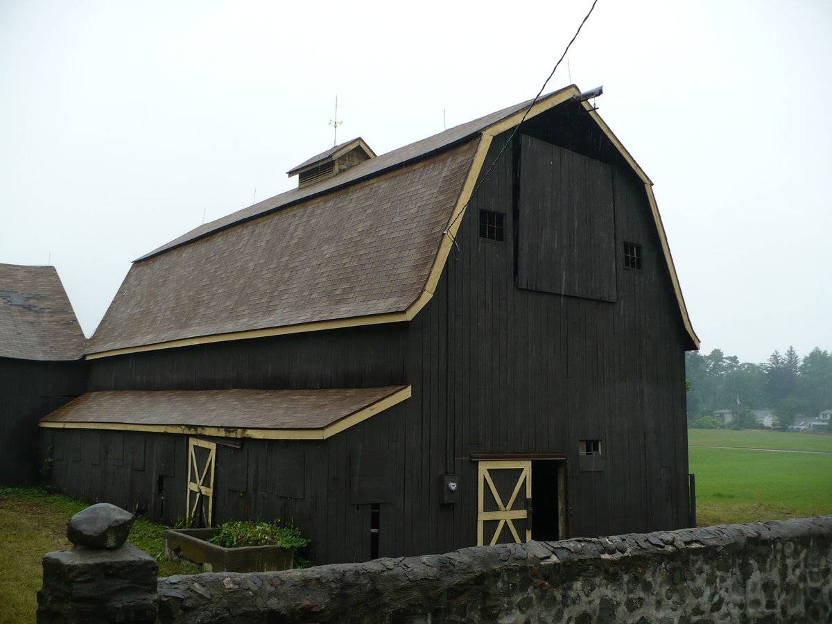 Both Barns I & II are sheathed in vertical wooden flush-board siding, painted deep brown. The trim along roof eaves and gable ends, where present, and the framing and bracing of all doors, is painted yellow. Both roofs are covered in brown asphalt shingles. A small monitor roof projection is present at the center of the length of Barn I’s ridgeline with long louvers down the eave-sides. This has a gable roof of the same roofing material and a weathervane at the ridgeline. Barn I’s gambrel roof also has flared eaves.