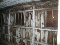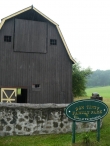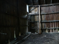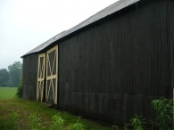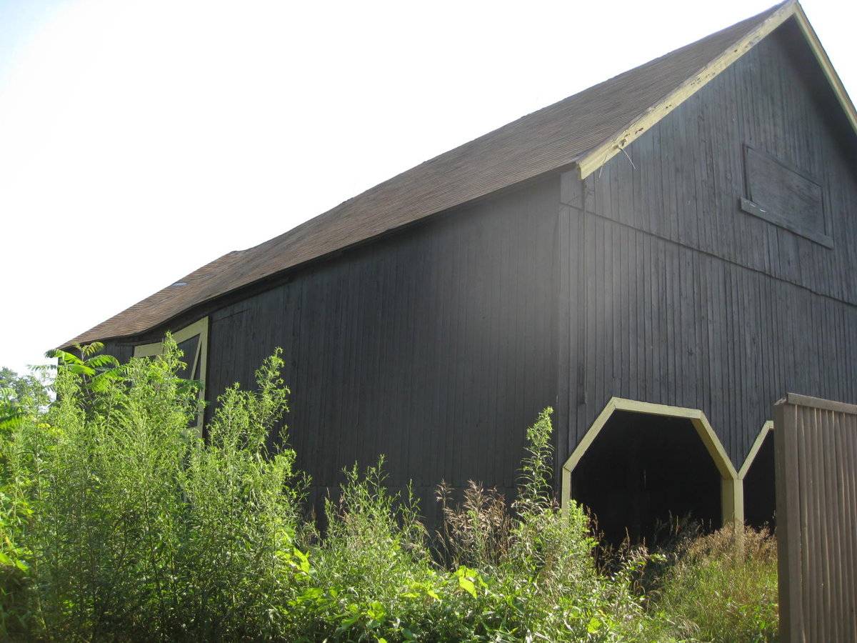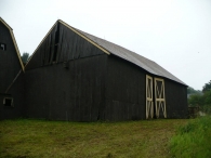 Barn I is a large 1 ½-story gambrel roof barn with a gable-entry. The primary façade of this barn is the east gable-end, which faces Main Street. A sliding pass-through door of braced wood construction is present near the center in the south half of this façade on the first story. To the immediate north of this door is a six-pane window. An electric meter is mounted to the wall near the southeast corner of the main barn. The east end of the addition has a single window opening which has been boarded over. The attic gable consists of a very large wooden plank hay door, hinged at the bottom, which is centered beneath the ridgeline. One six-pane window is present to each side of this central door. The area between the top of the door and the roof has no siding but has a chicken wire mesh providing ventilation to the attic-loft. The north eave-side appears to be blank. The west gable-end appears to be a mirror image of the east gable-end, with wooden braced pass-through door located just to the south of center on the first story, with a small window between this door and the southwest corner. Two windows are placed in the attic-loft in the same places as they are found on the opposite gable-end. The shed roof addition extends off the south eave-side of the barn, stretching the barn’s full length. The shed roof begins slightly below the eave of the main gambrel roof. A single braced wooden pass-through door is present roughly halfway between the center and the southeast corner of the addition.