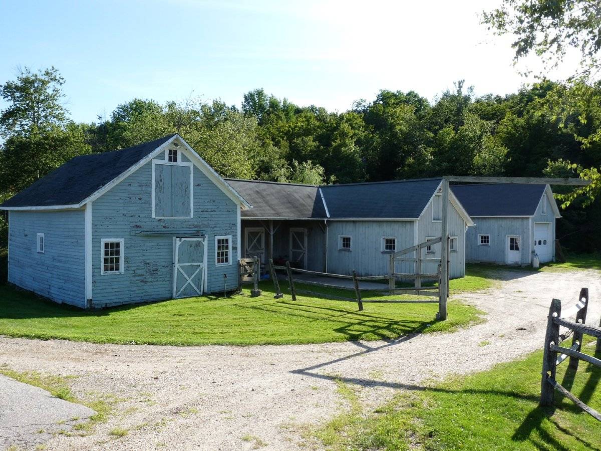 The two barn complex is located in the northeast corner of the property abutting to Goshen Street East. The dutch-gambrel roof bank barn, Barn-I is located towards the north while the E-shaped cross-gable roof, Barn-II, is located towards the south. The ridge lines of both the barns run east-west parallel to the road. The two barns are separated by timber fencing while dense woodland covers the area towards the west and the south. A sign board displaying the name of the farm as ‘ARCADIA FARM: Certified Holsteins’ can be seen towards the southeast of Barn-I.