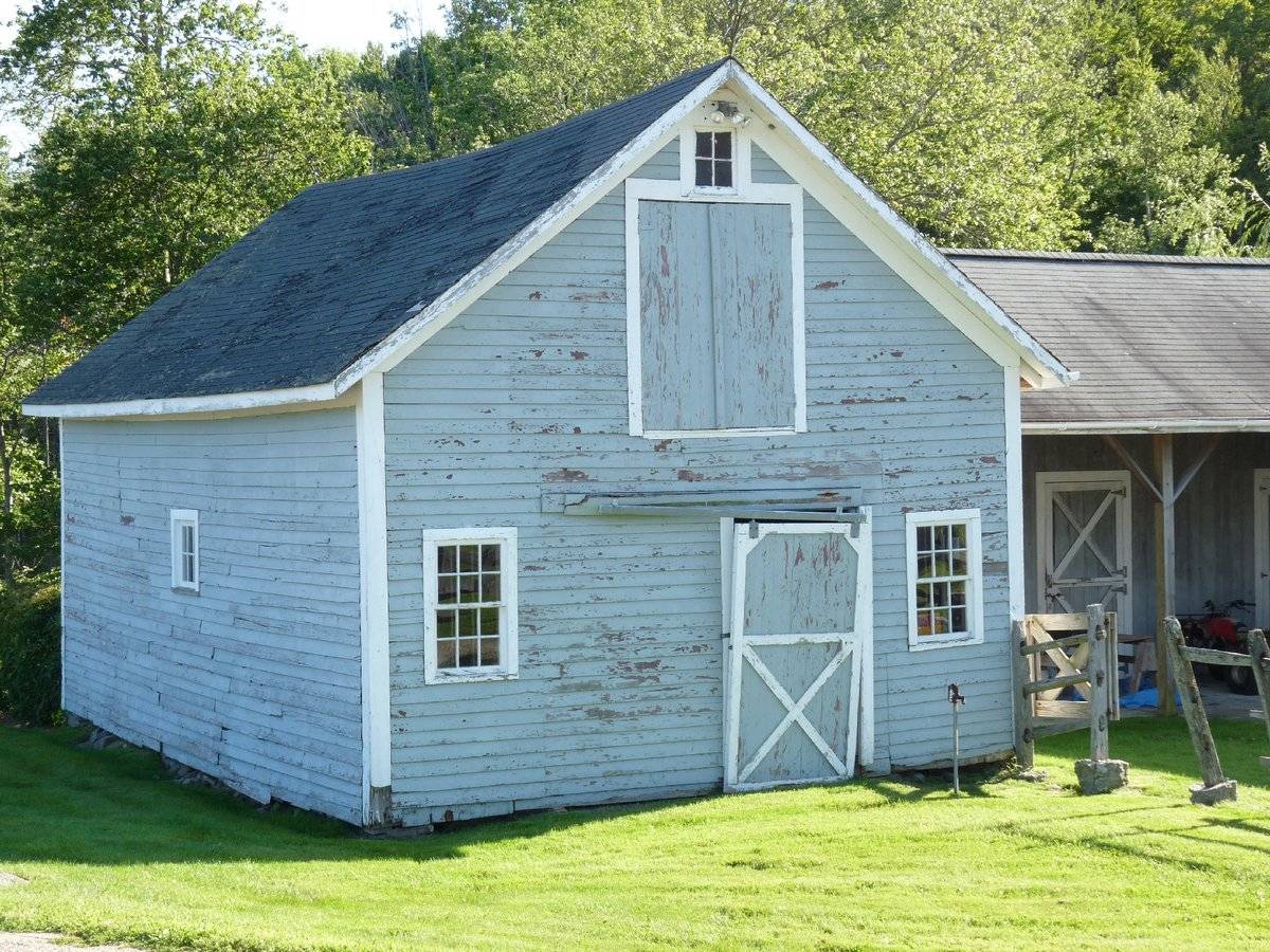 The wooden frame of the E-shaped barn complex is supported on field-stone masonry foundation and has asphalt shingle roofing. The barn complex has light blue painted vertical siding on walls with white corner boards apart from Arm-I which has light blue painted horizontal siding.