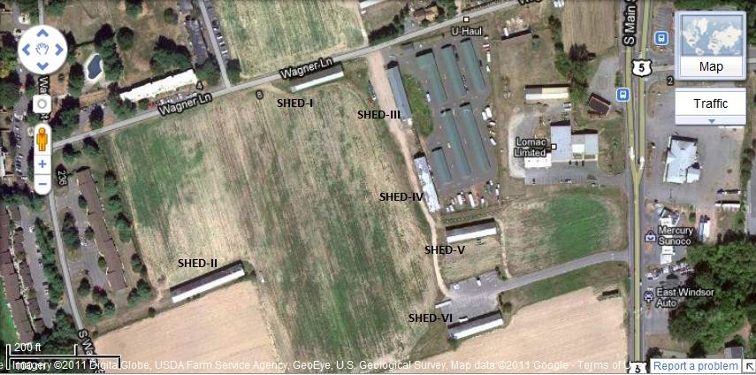 This is a barn complex of six tobacco sheds towards the south of Wagner Lane delineated into three clusters based on their similar character, orientation or physical proximity: Cluster-A, Cluster-B and Cluster-C. The following is the description of Cluster-C while Cluster-A is discussed in http://www.connecticutbarns.org/index.cgi/23938 and Cluster-B is discussed in http://www.connecticutbarns.org/index.cgi/23941.