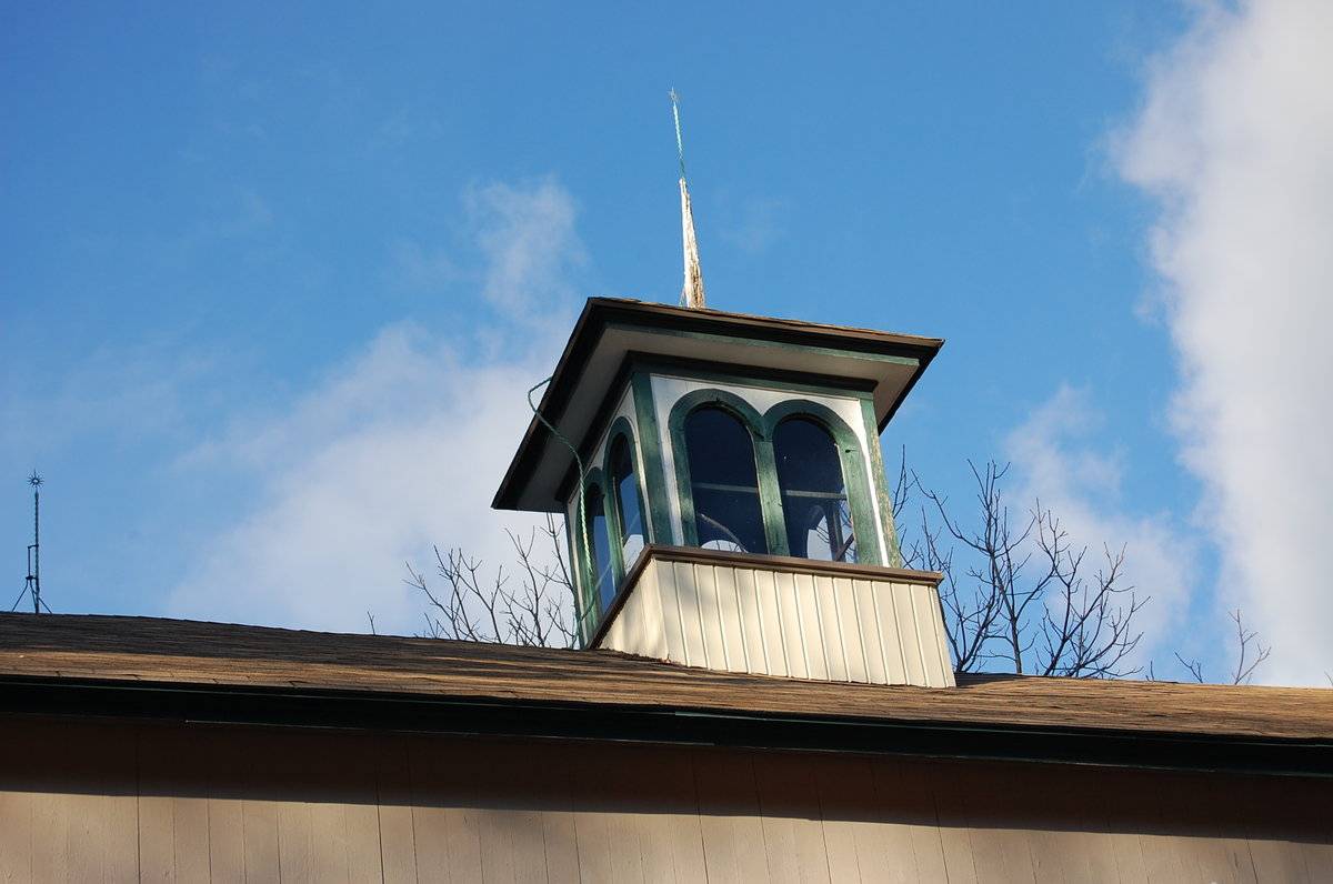 The gable roof of the barn has a hip-roofed cupola with a finial at the apex and a pair of arch-topped one-over-one double-hung windows on each side. The cupola is approximately centered on the ridge-line, hence not located above the threshing floor bay. The deep overhangs at the eaves and rakes have sloped soffits finished in wood trim.