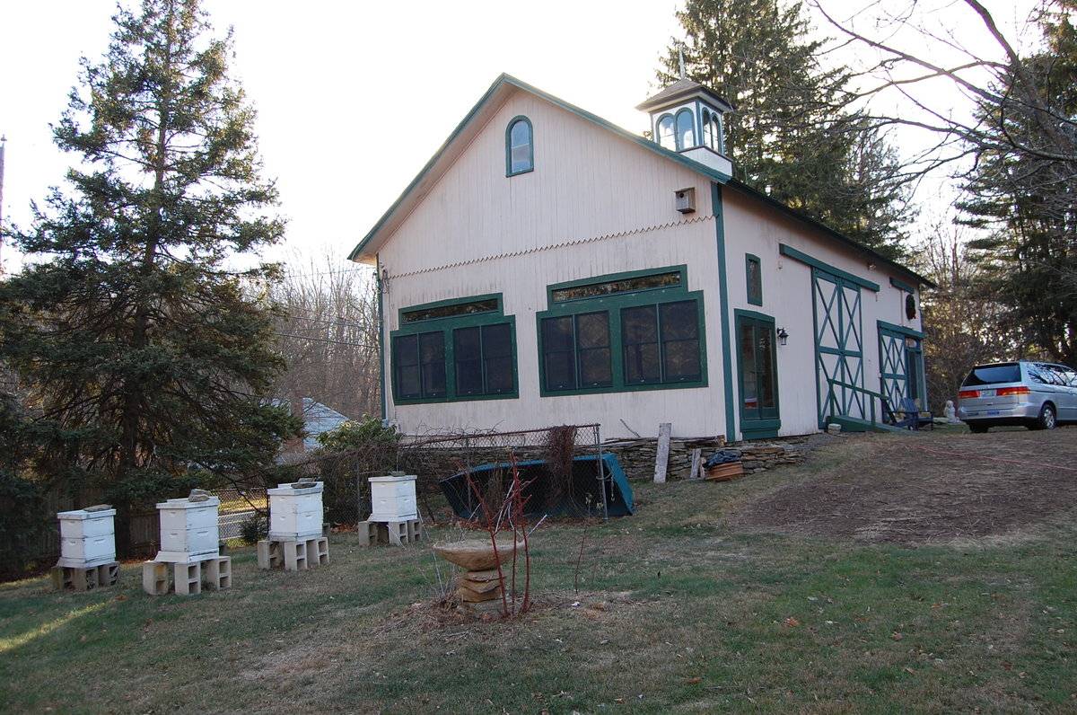 Active agriculture is continued at the site with chickens in a historic coop and beehives adjacent to the barn.