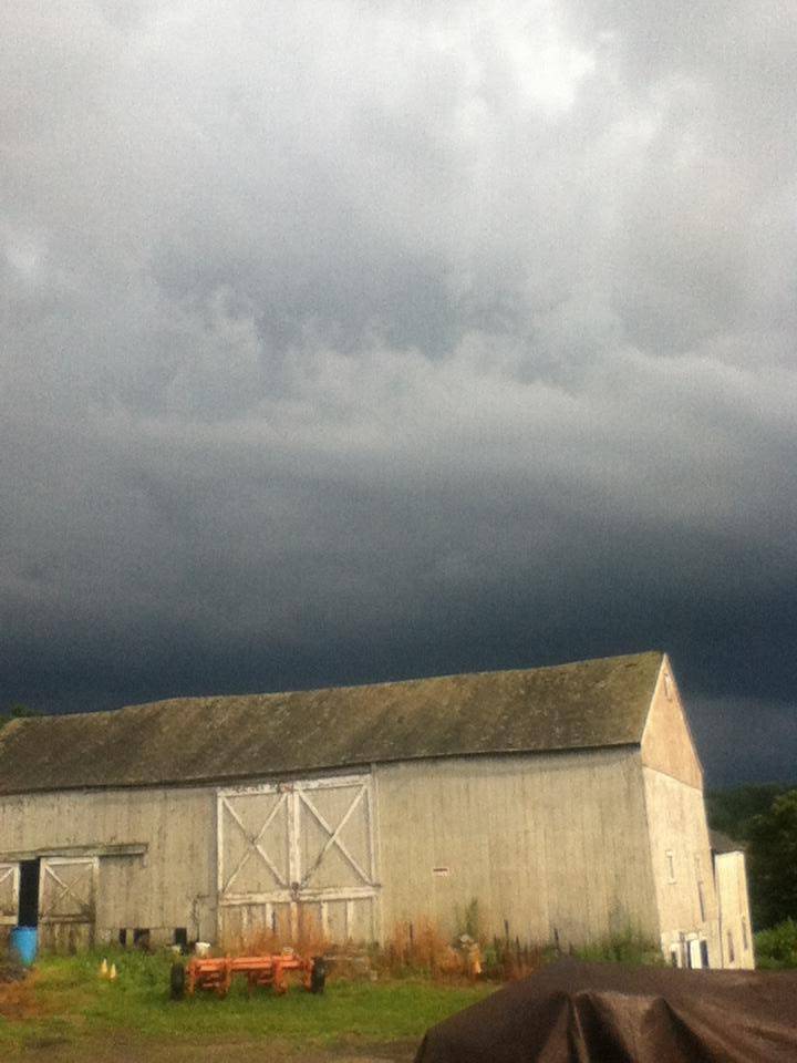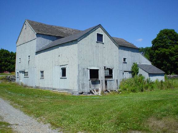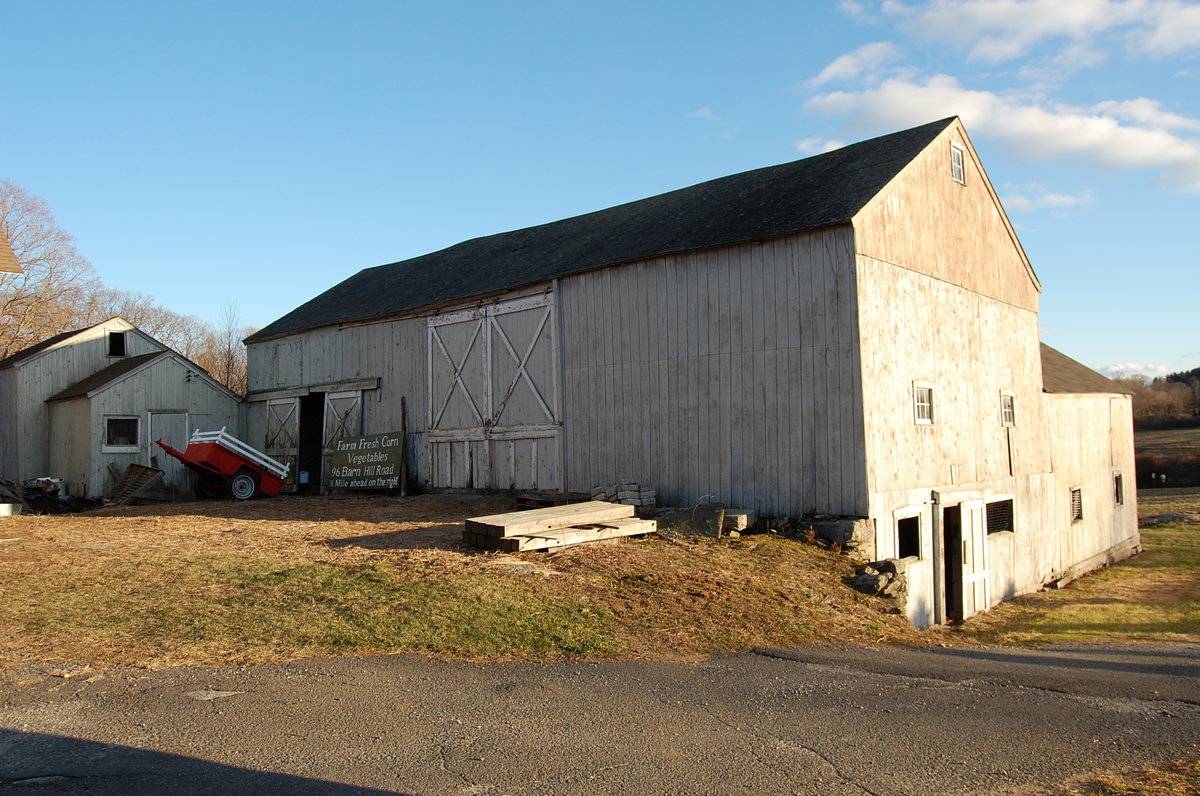 This farm has five barns. The original barn circa 1823 (Barn I - gray) is English style post & beam construction with vertical siding and asphalt roof shingles, was used as a dairy barn. In addition to the main barn is a small barn (Barn II - gray) attached to the north east end of the main barn, an implement shed (Barn III - red), a small roadside sales barn where they sell their seasonal vegetables and a more recent barn (Barn IV - red) with windowed cupola. All the barns are English style. This farm was a part of the original Shelton Family farm and reaches to Shelton Road (Route 110). Also see - Part - 2/3 : http://www.connecticutbarns.org/index.cgi/2385 Part - 3/3 : http://www.connecticutbarns.org/index.cgi/41324